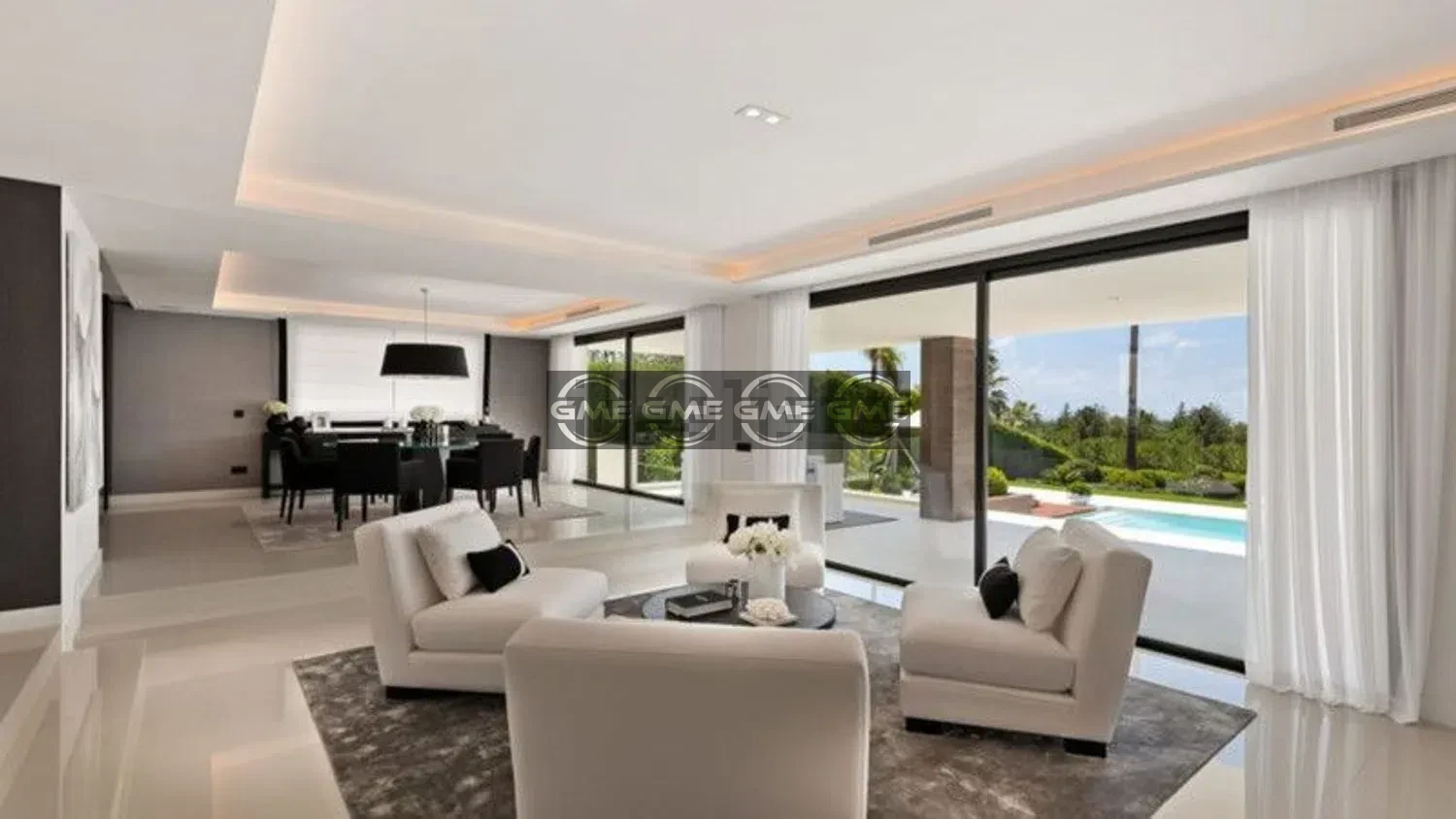 Outdoor areas include a heated swimming pool, landscaped garden, barbecue area, and a sunken seating area designed for outdoor living.