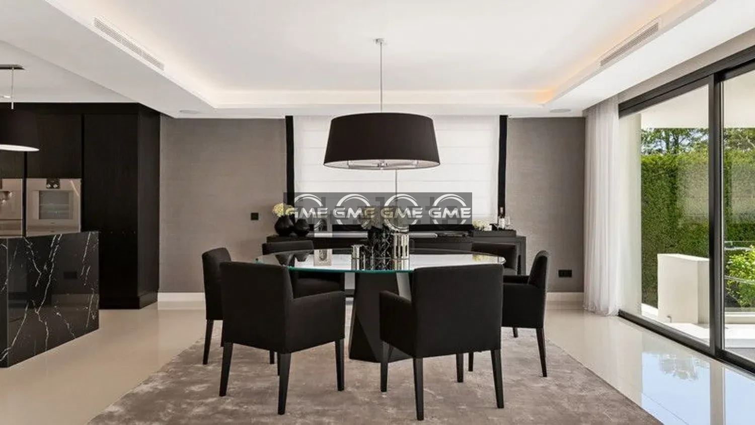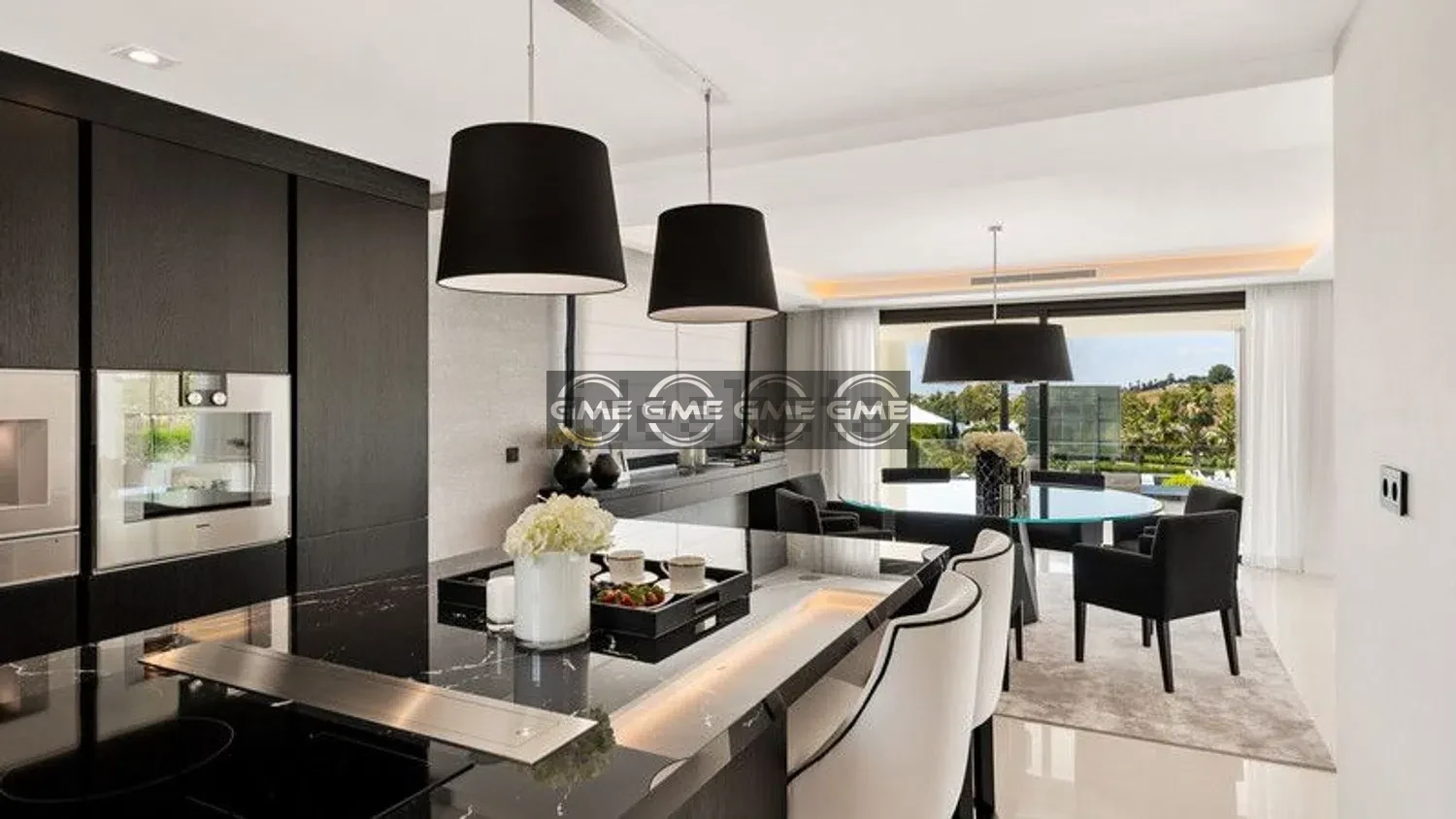 The property is distributed over three floors and comprises six bedrooms and six bathrooms. The main level features a bright living and dining area with direct access to the terrace, along with a fully equipped designer kitchen fitted with Gaggenau appliances. A separate office is also located on this floor.