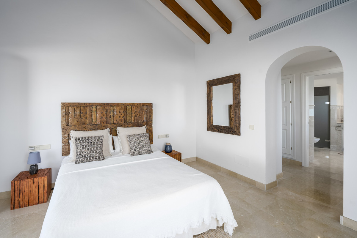 The villa's interior balances traditional Andalusian style with a hint of bohemian flair. Upstairs, the second level hosts a generous master bedroom, complete with a private terrace and an expansive en-suite bathroom featuring an open shower and bathtub. This floor also includes an additional en-suite guest room for convenience.
