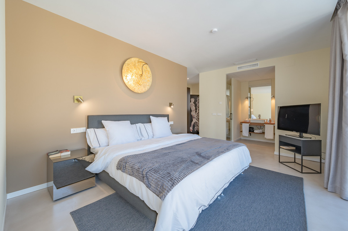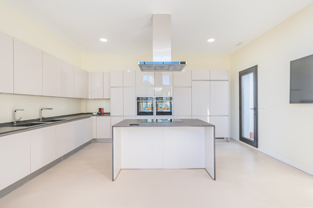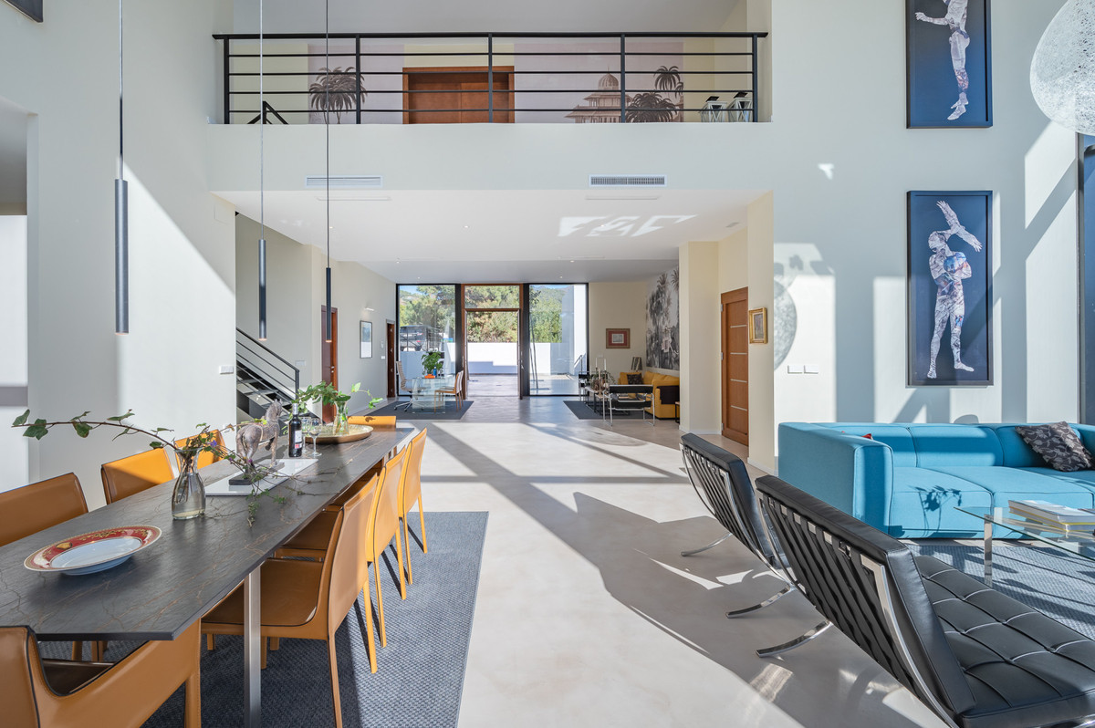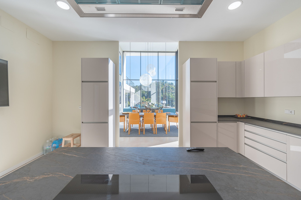 The heart of the home is the bright and spacious living area, featuring high ceilings and large sliding glass doors that flood the space with natural light and open directly onto the terraces. Just off the living room is a fully equipped modern kitchen and a separate dining area, perfect for everyday living or entertaining. The villa currently offers six large bedrooms, each with its own en-suite bathroom and seven toilets. There is also a guest apartment, a private office, and multi-use rooms, including a laundry and storage space. The additional 100 m² of convertible space represents tremendous value-add potential for the discerning investor.