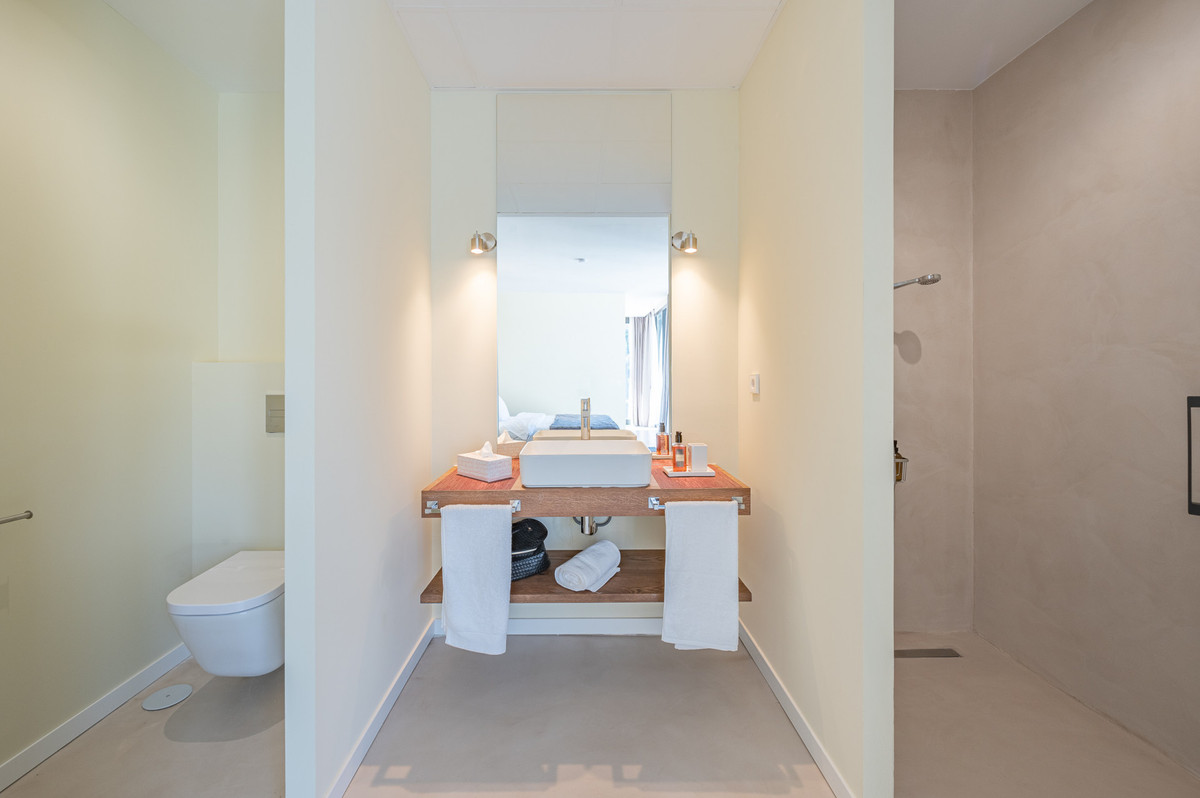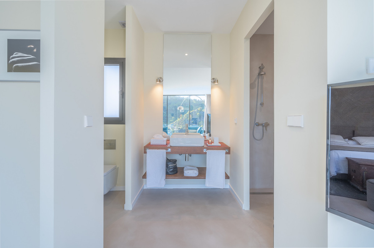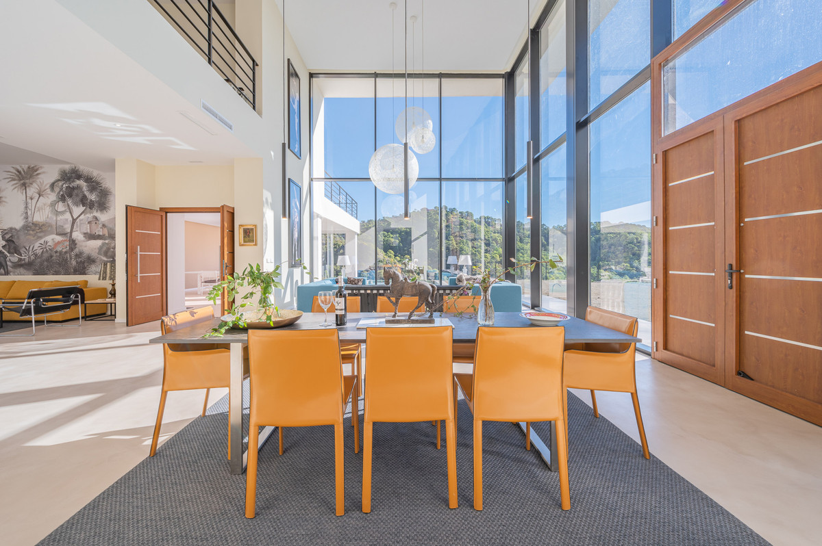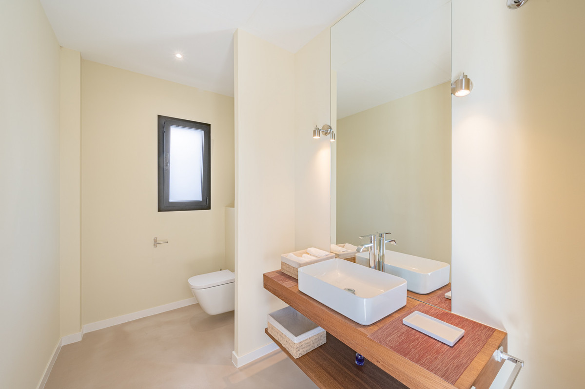 The heart of the home is the bright and spacious living area, featuring high ceilings and large sliding glass doors that flood the space with natural light and open directly onto the terraces. Just off the living room is a fully equipped modern kitchen and a separate dining area, perfect for everyday living or entertaining. The villa currently offers six large bedrooms, each with its own en-suite bathroom and seven toilets. There is also a guest apartment, a private office, and multi-use rooms, including a laundry and storage space. The additional 100 m² of convertible space represents tremendous value-add potential for the discerning investor.