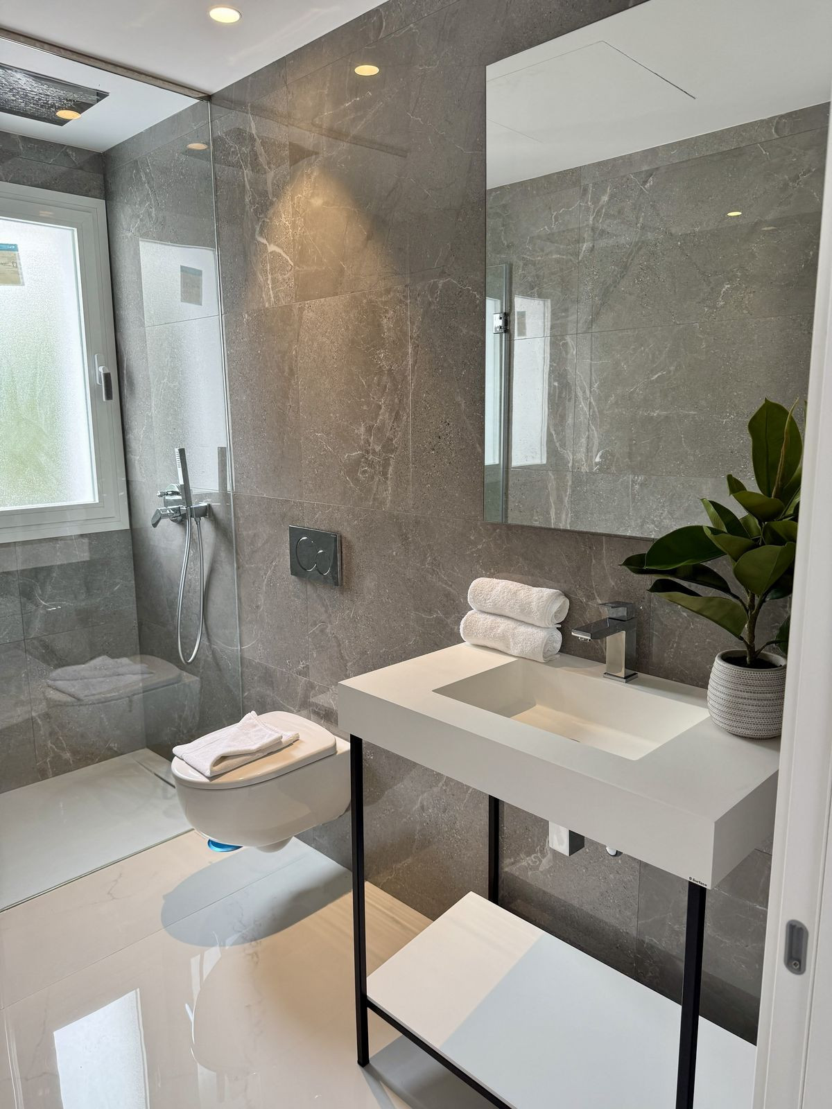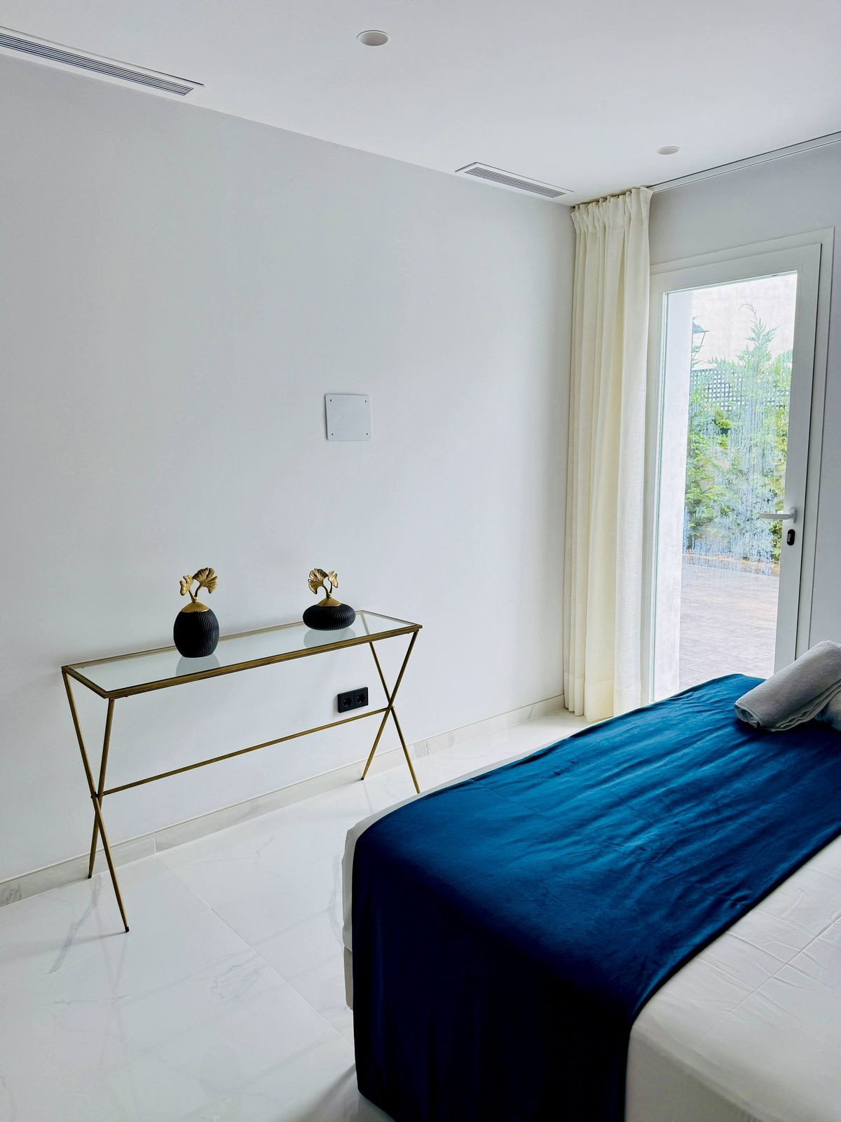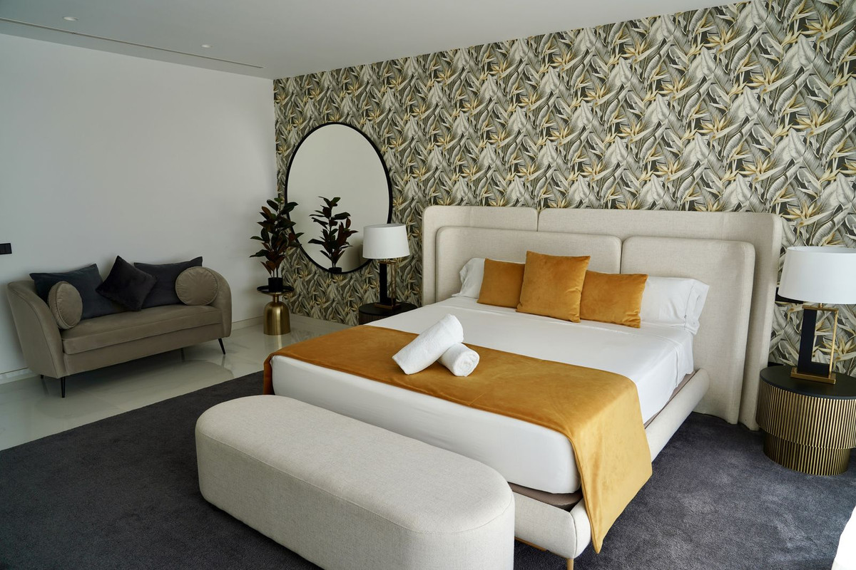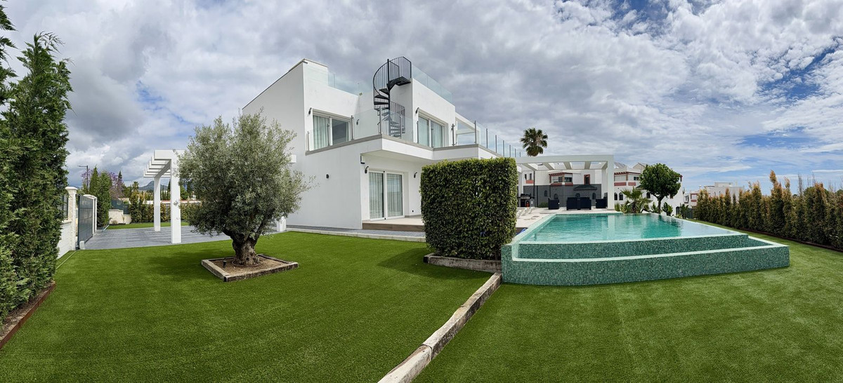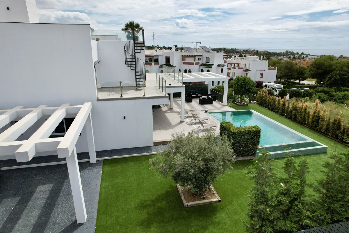 Luxury Villa in Cancelada – Costa del Sol Exclusive detached villa, newly built, located in one of the most sought-after areas of the Costa del Sol. With a contemporary design and top-quality finishes, this property offers the perfect balance of elegance, comfort, and technology. The villa boasts 5 spacious bedrooms and 6 en-suite bathrooms, distributed over 400 m² of built area, with a spectacular 150 m² terrace and a 900 m² private plot with landscaped gardens. Its south-facing orientation ensures exceptional brightness throughout the day, with panoramic views of the sea, mountains, and surrounding nature. Outdoors, you will find a heated private pool, barbecue area, and solarium – perfect for enjoying the Mediterranean lifestyle. Indoors, the villa features bright, open spaces equipped with home automation, air conditioning, marble floors, jacuzzi, gym, games room, wine cellar, staff accommodation, and a fully fitted kitchen. The property is sold fully furnished with carefully selected high-end pieces. Additional highlights include an elevator, covered and uncovered terraces, storage room, utility room, and basement. Security is guaranteed with an alarm system, safe, and double glazing. The parking facilities are excellent, offering underground garage, covered parking, and space for several vehicles. The house is also equipped with photovoltaic solar panels for energy efficiency and sustainability. Prime location: just minutes from golf courses, shops, the beach, schools, and town center. In short, this is a luxury property, exclusive and move-in ready, combining comfort, style, and a privileged setting.