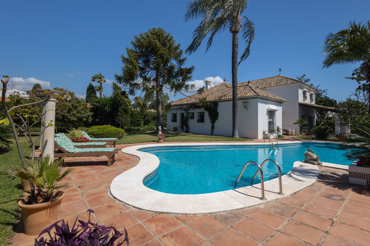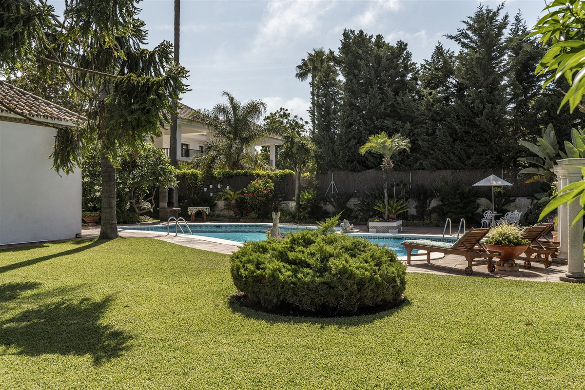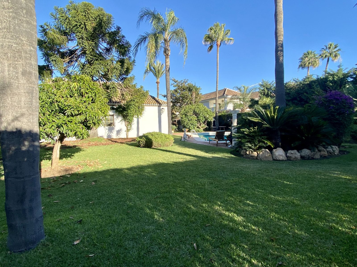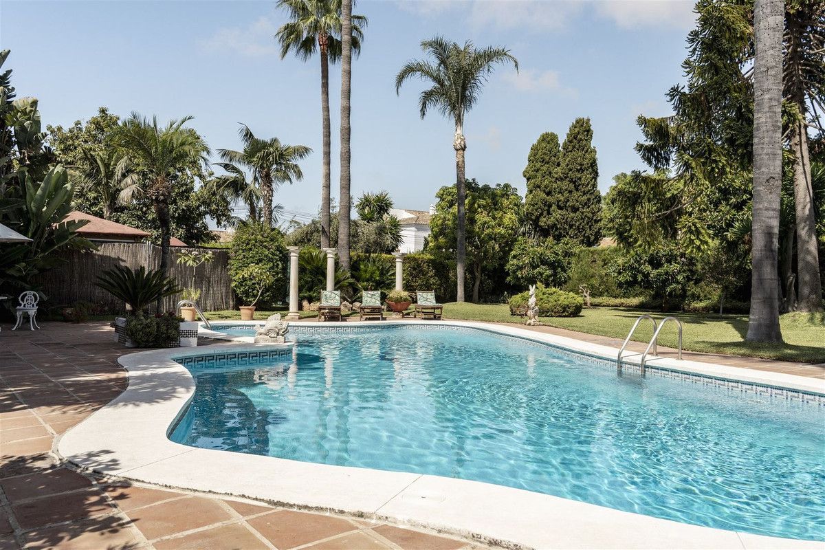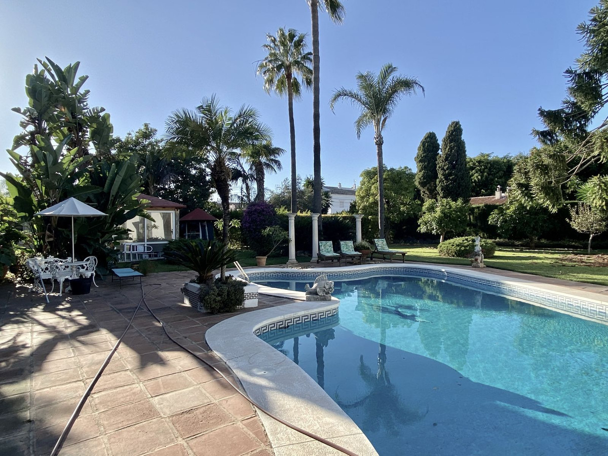 Villa on a large plot located between San Pedro de Alcantara and Puerto Banus. Plot of 2000m2 with a large mature garden and a swimming pool with BBQ area. The plot is located between two streets and only 500 metres from the beach. Walking distance to San Pedro de Alcantara and Puerto Banus. An unbeatable location, in an area of great potential. On the plot there is currently built a very well maintained Andalusian style house. Entrance hall with typical Andalusian tiles, large living room with double height ceiling with marble fireplace, a second family room, 5 bedrooms, 4 bathrooms and 1 guest toilet. Low density area with easy access to the beach, motorway and Puerto Banus. Close to shops, restaurants and international schools. This same plot has the possibility to be divided into two independent plots to build two houses.