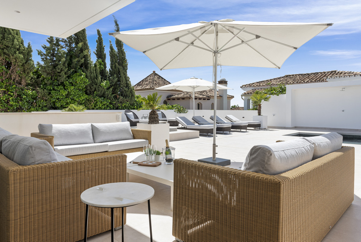 Entrance Level Step inside Casa Rosario to discover a haven of comfort and style, with underfloor heating all throughout the villa adding to the numerous luxurious amenities. The entrance level features a spacious living area, kitchen, and dining room, all seamlessly connected for effortless living. Floor-to-ceiling glass doors flood the space with natural light and open onto a spacious terrace, where residents can enjoy al fresco dining or simply soak in the Mediterranean ambiance. On the terrace outside, the heated pool has been tastefully extended for year-round enjoyment. The rejuvenating jacuzzi, rainfall shower, and inviting dining area, with a fitted BBQ grill, complete the outdoor oasis, promising moments of bliss under the Spanish sun. The villa boasts five bedrooms, each with its own ensuite bathroom, two of which are found on this level.