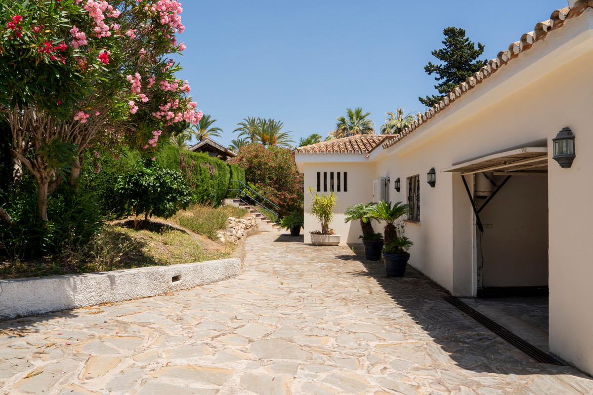 Situated in a prime location in El Paraíso, Estepona, this south-facing villa offers great renovation potential just a 10-minute walk from the beach and close to shops, restaurants, schools, and public transport. The single-level villa includes three spacious bedrooms, a guest apartment with an ensuite bedroom, four bathrooms, and a guest toilet. Multiple terraces provide ample outdoor living space, with the upper level offering potential for a sea view area. The property features a private garage, mature gardens, and plenty of space to add a pool if desired. Additional amenities include air conditioning, fitted wardrobes, double glazing, terraces, a guest room, and an alarm system. This rare opportunity allows for full customization in one of Estepona’s most desirable residential areas, close to golf, the beach, and essential amenities.