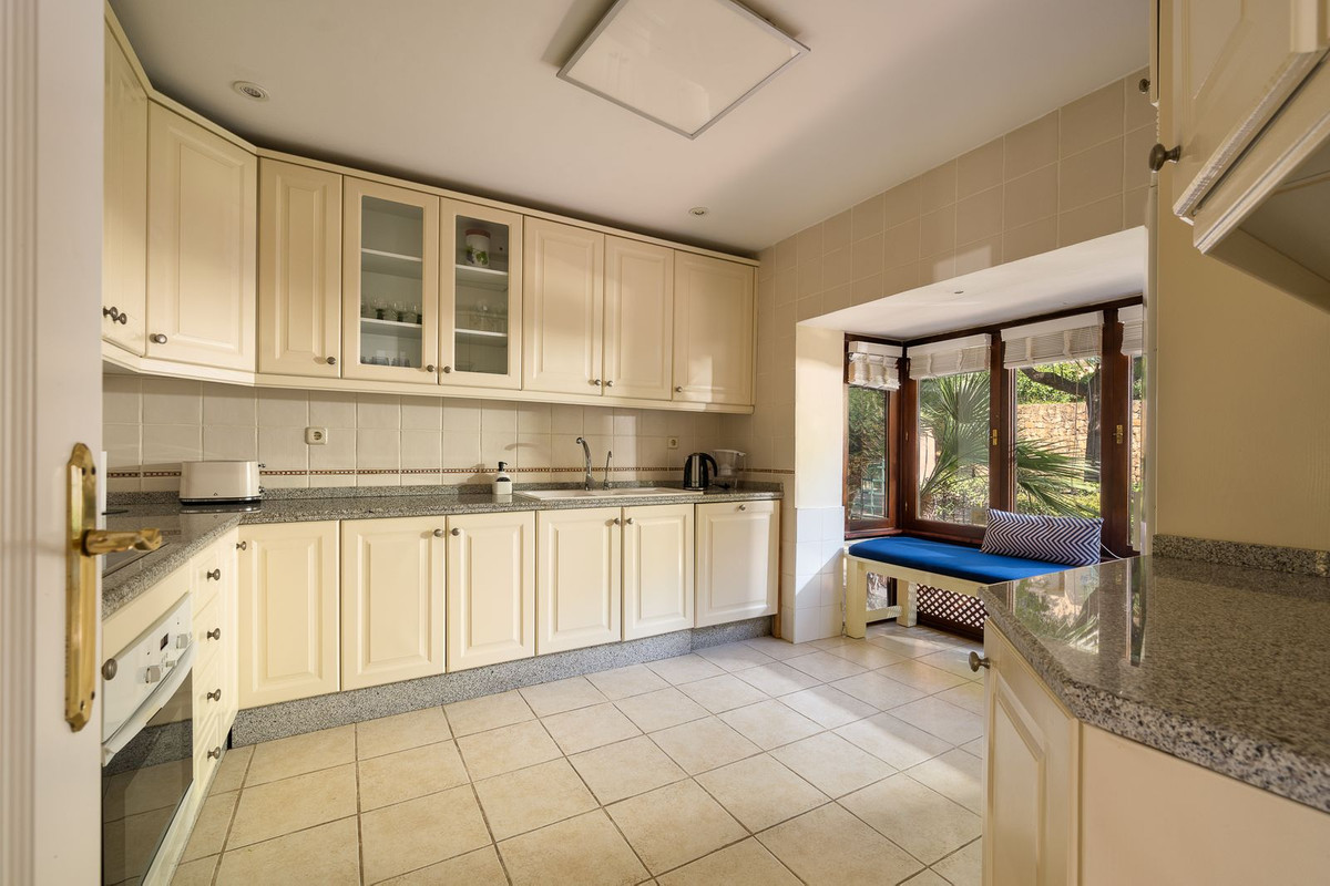 On the ground floor, a spacious entrance hall opens to a grand living and dining area with direct access to the main terrace — the perfect setting for al fresco dining beside the garden and pool. The kitchen, featuring a charming bay window and cosy seating nook, is designed for relaxed mornings and long Mediterranean lunches. This level also hosts two generous en-suite bedrooms, ideal for family or guests.