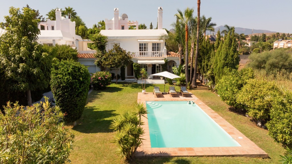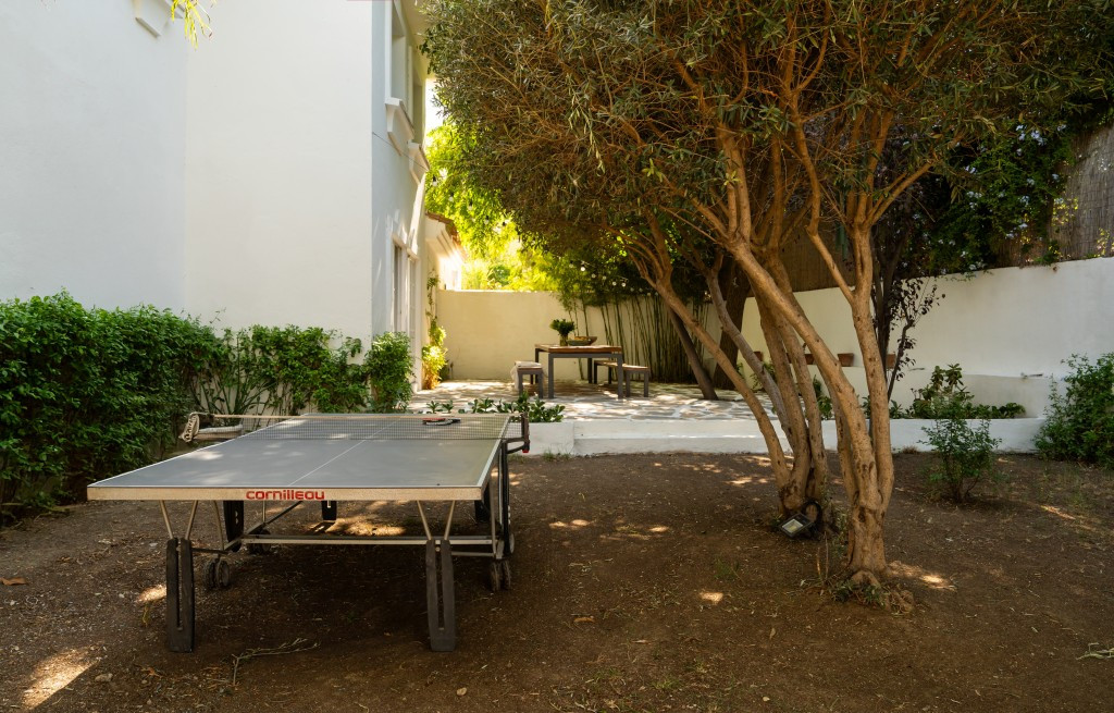 The lush, mature garden with fruit trees surrounds a south-facing pool and shaded dining terrace, offering peaceful privacy and outdoor living year-round. Sea glimpses add a touch of magic to this delightful home.