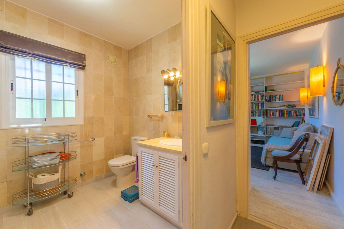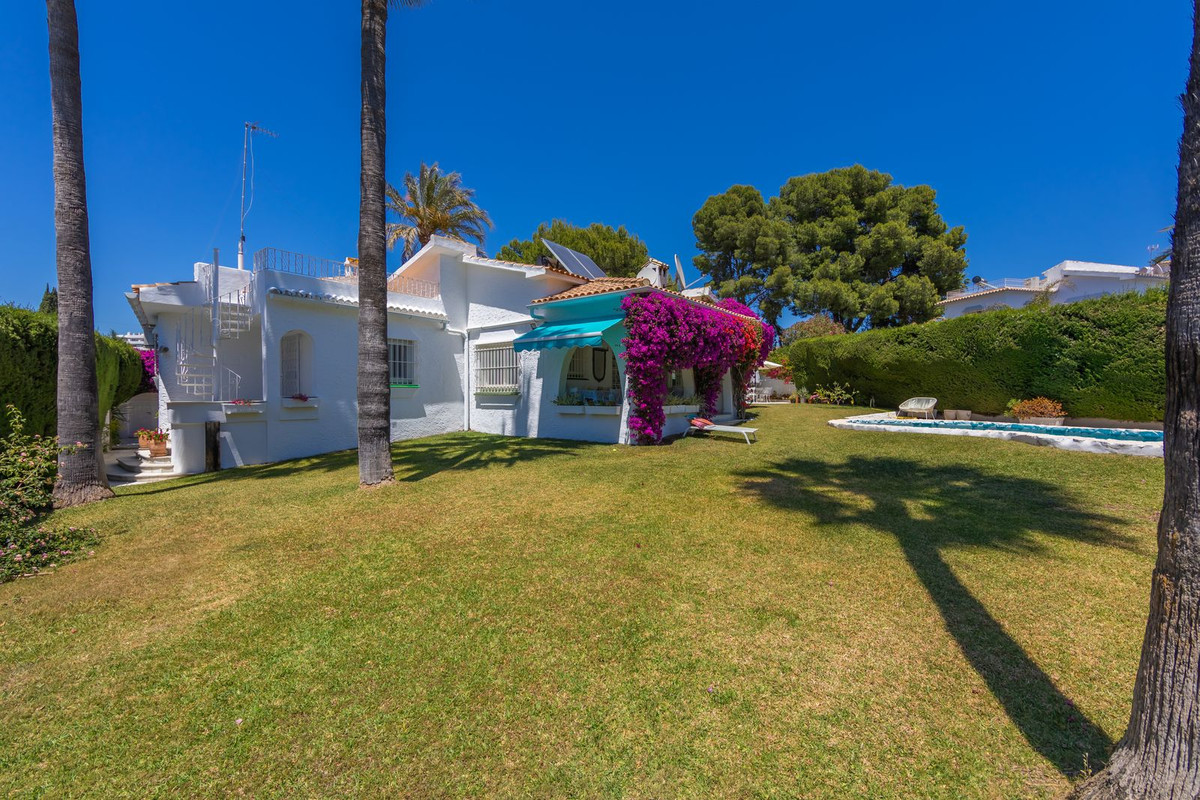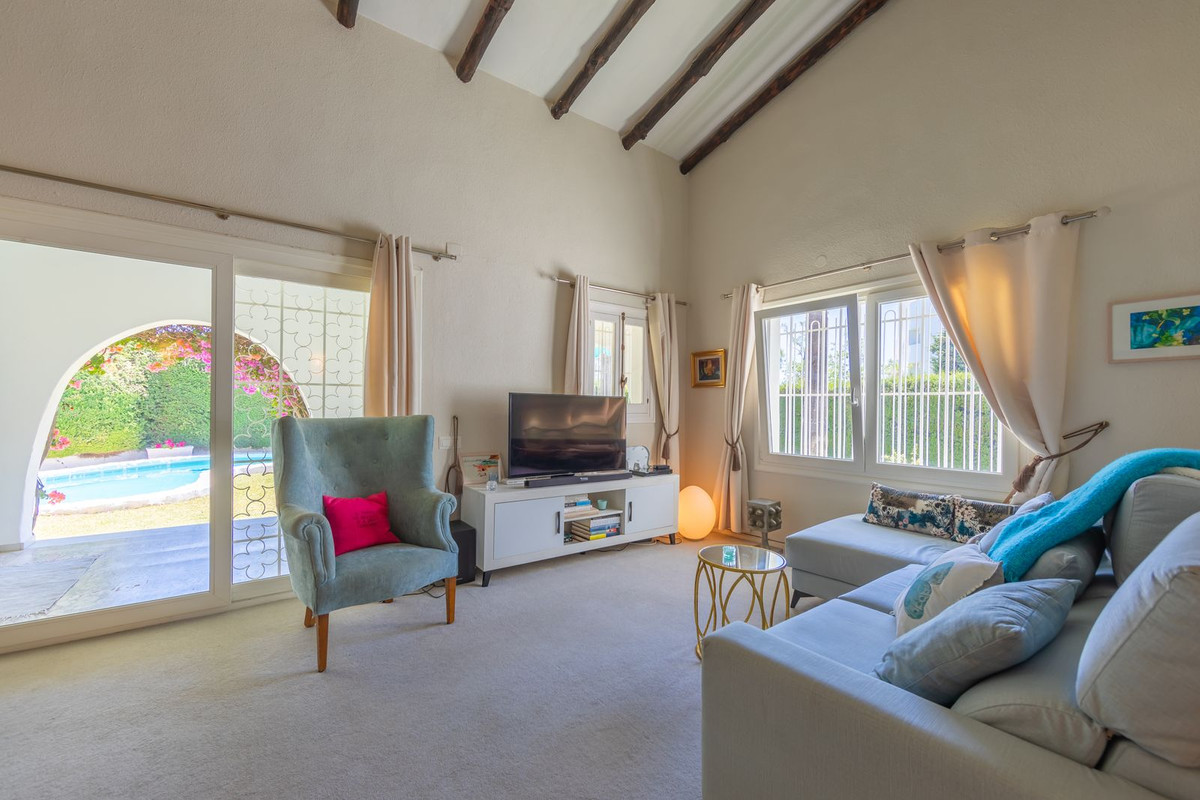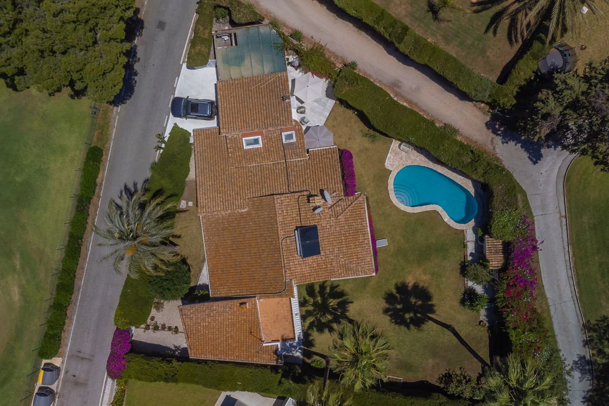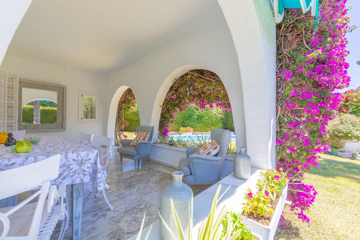 VILLA WITH ATTRACTIVE AND BEAUTIFUL MEDITERRANEAN CHARACTER, DISTRIBUTED ON A COMFORTABLE GROUND FLOOR AND LOCATED ON THE FIRST LINE OF GOLF, OF THE PRETIGIOUS REAL CLUB DE GOLF DE GUADALMINA. Located in a corner, in a cul de sac, located by the 18th Tee of the south . Enjoy a beautiful mature garden, very well maintained, with a multitude of trees and plants. LOCATED, 2 km from San Pedro de Alcántara and 6 km from Puerto Banús. Estepona and Marbella 15 min. Restaurants, Shops, and Leisure Areas just a 10-minute walk away and the beach a 5-minute drive away. Completely surrounded by Golf Courses and just a 3-minute walk from the golf clubhouse. (Golf share optional). Enjoy complete tranquility and privacy. South facing with great light and relaxing views of its excellently maintained mature garden and pool. It has a parking area for 2 cars at the entrance of the house plus a closed garage. In good condition and magnificently built, this property is distributed on a very comfortable single level. With a living room with high ceilings with wooden beams and direct access to the porch, garden and the kidney-shaped pool. The master bedroom en-suite with dressing room and direct access to the garden. A large and very bright kitchen with also high beamed ceilings and a dining area located next to the access to the parking area. The other good size bedrooms share 2 full bathrooms. The home has the option of separating an apartment by a door. From the cozy solarium enjoy relaxing views of the garden, golf courses and mountains. It also features a semi-basement with access from outside the house that could be used as a gym, games room, etc. It has great possibilities to change its distribution. We highly recommend visiting this fantastic property.