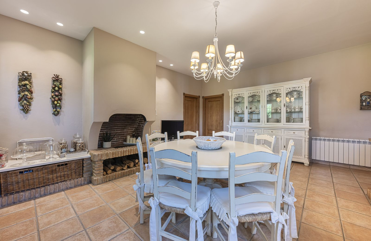 The main entrance leads to a stately hall, where there is a large kitchen with fireplace, pantry, laundry room, several spacious and bright bedrooms, and bathrooms decorated in a refined Andalusian style.