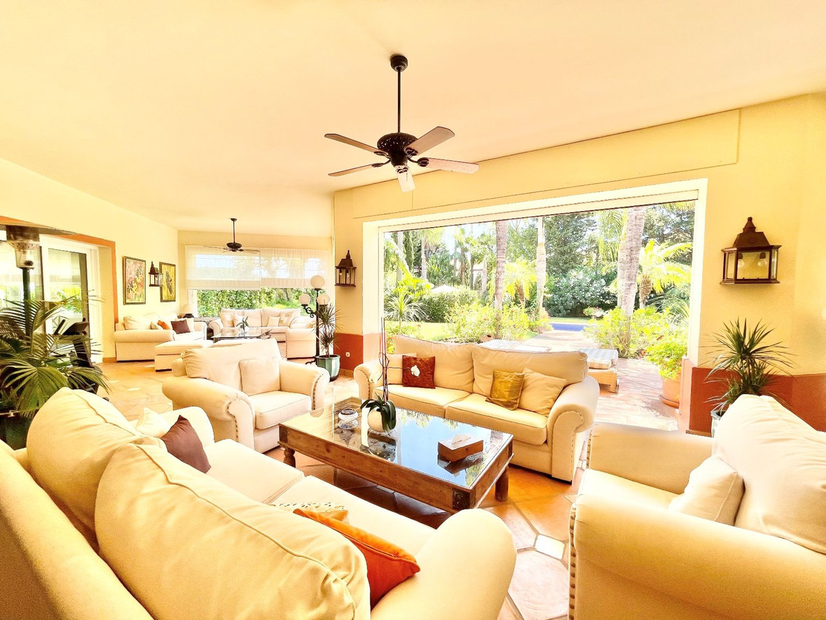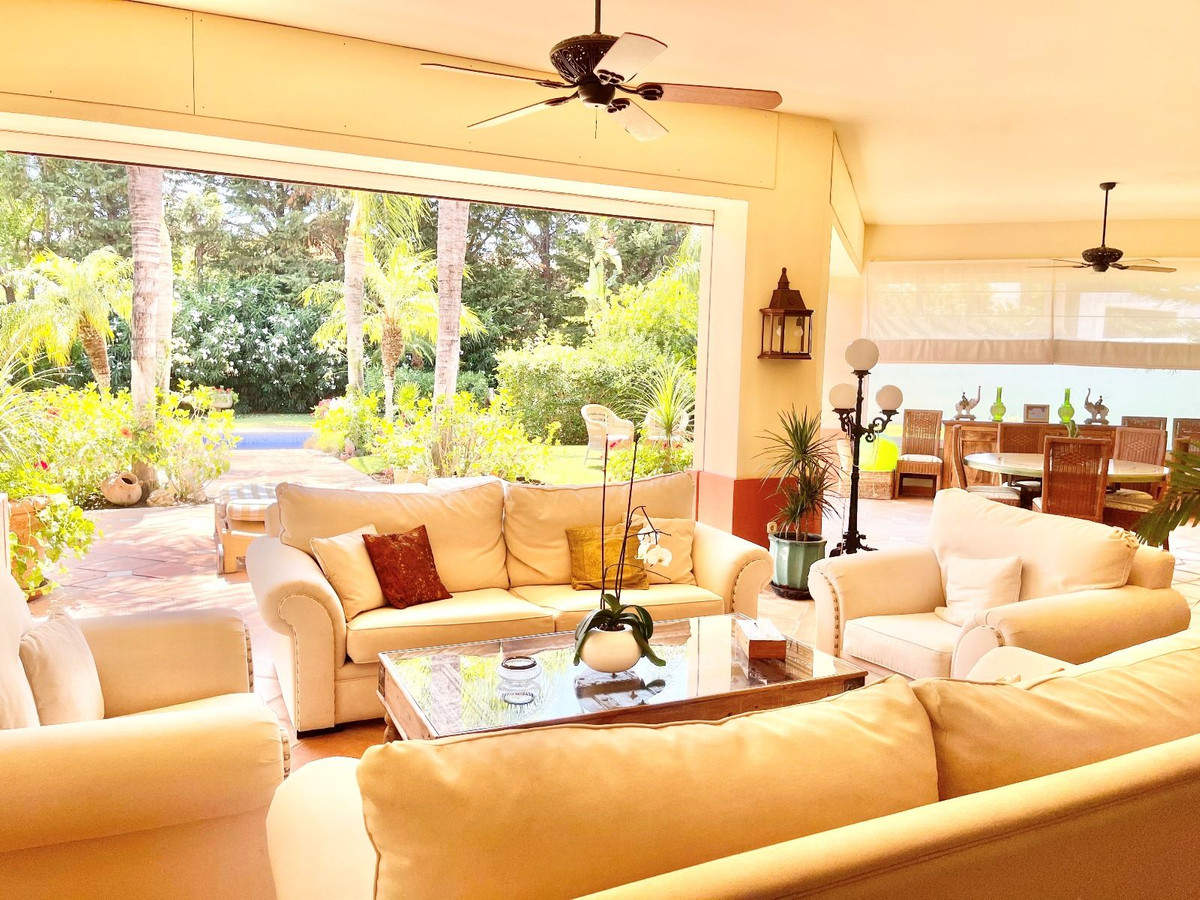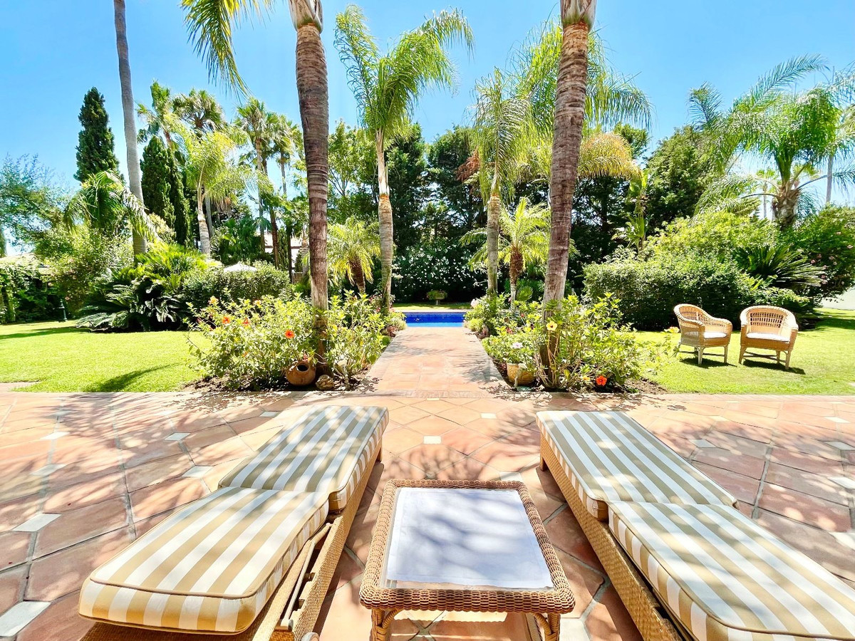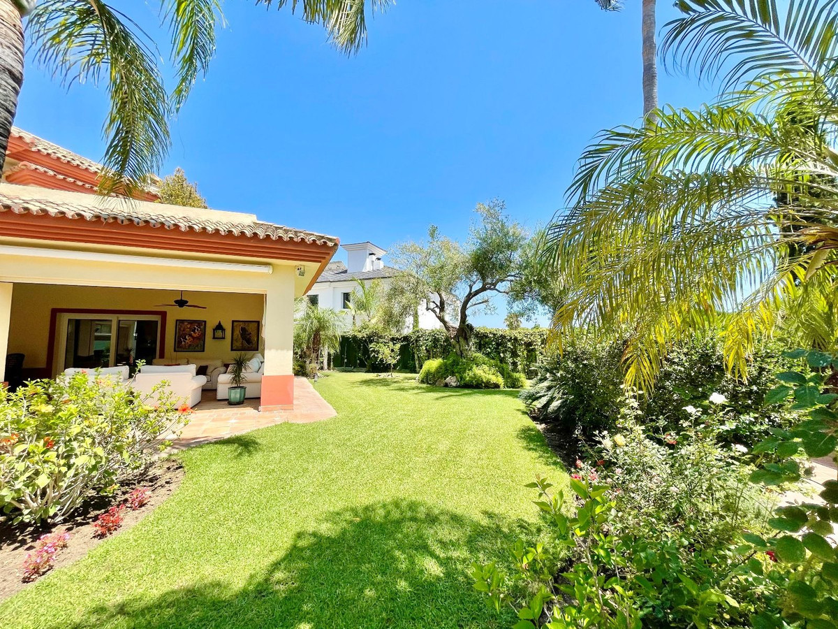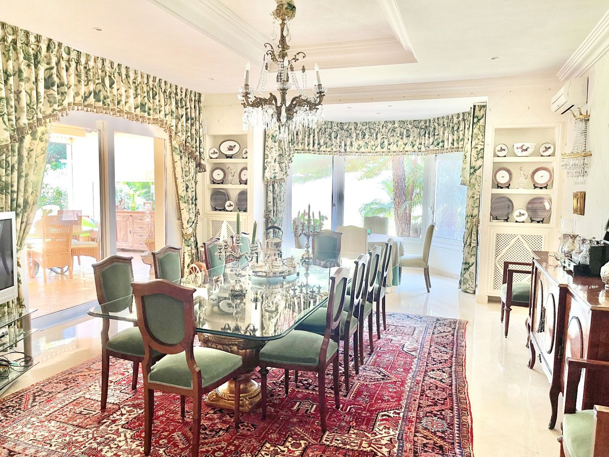 Spacious and bright villa in Guadalmina Baja, Marbella, a few steps from the luxurious beaches, restaurants and promenade. Very large bedrooms with bathrooms, two living rooms and a dining room, fully equipped modern kitchen, underground garage for several cars. Wine cellar, in the lower room equipped apartment for staff. Pool 108 m2, well-kept garden.