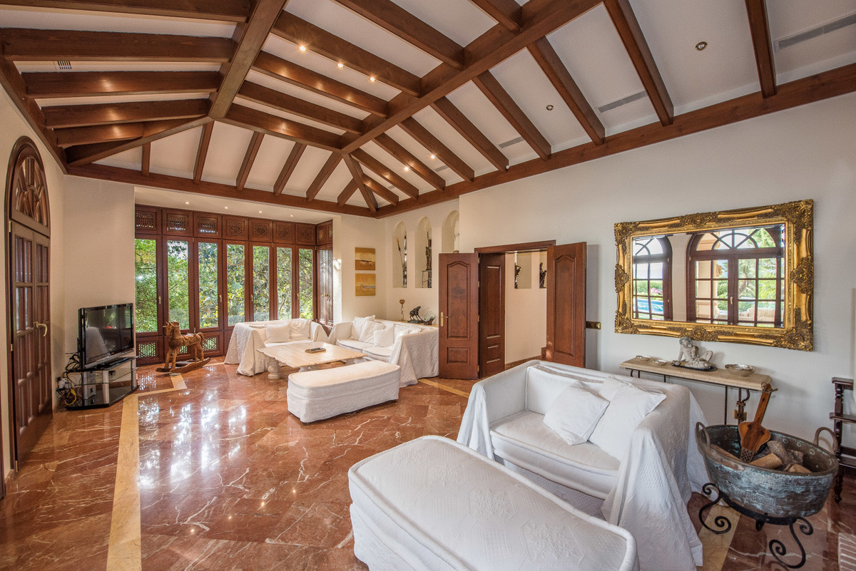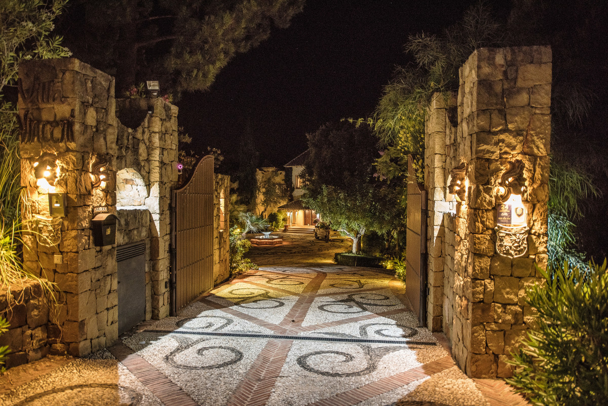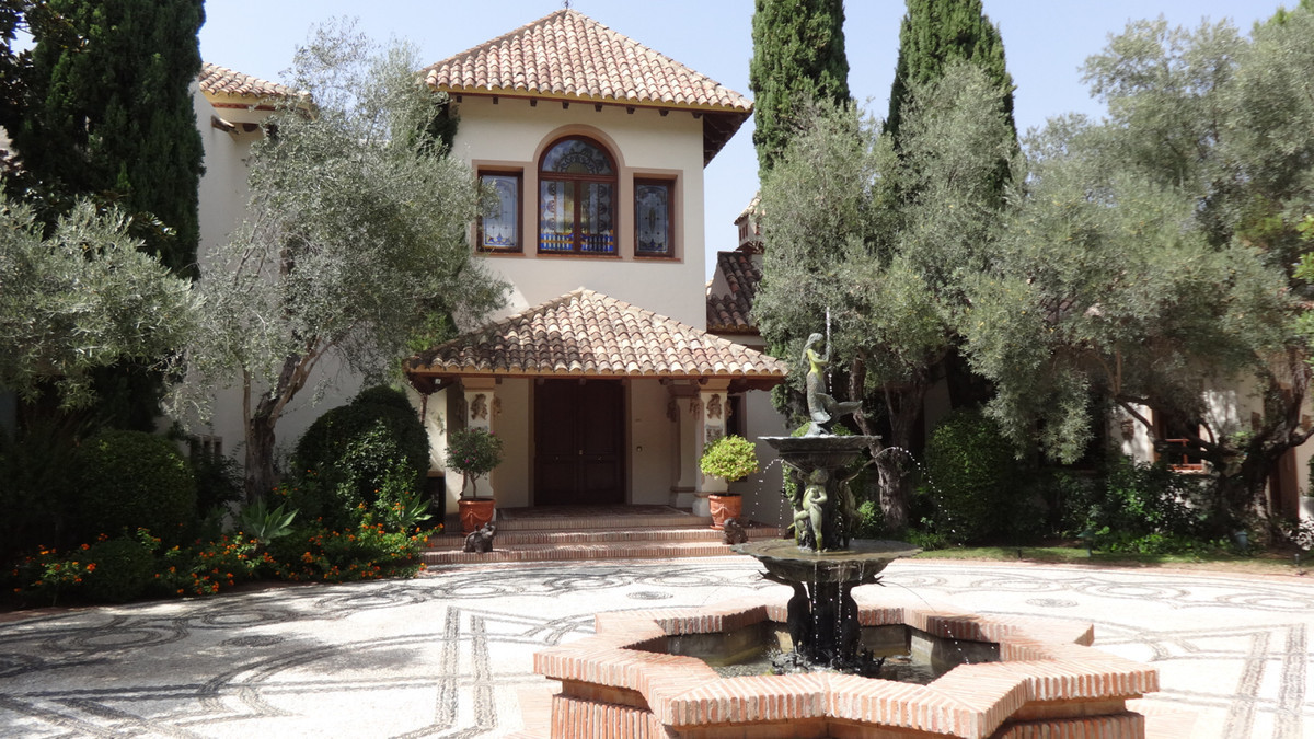 CHARMING AND LUXURIOUS HOLIDAY DOMICILE IN MARBELLA The property without direct neighbours is located in a luxury urbanization, La Zagaleta, Marbella. Offers exceptional and high-quality equipment, a fantastic view and a spacious pool landscape. The main house, a splendid Spanish villa, climbs behind the pompous natural stone-built driveway with fountains. Master Bedroom with luxurious marble bathroom and terrace with distant views, 4 further bedrooms with terraces and marble bathrooms and 2 children's rooms with shared bathroom. Spacious living spaces with charming and cosy furnishings completes the Spanish flair. In total, the house also has 6 terraces, kitchen, 2 garages for 4 cars, a spacious and fully equipped fitness center and a beautiful pool landscape with 2 differently tempered pools and a whirlpool. The beautiful green garden leads to a built in the hillside glass studio / yoga / meditation house and a children's playground. The guest house has 2 further in-suite bedrooms, a living area and a kitchen. Marbella is about 15 minutes' drive away, Malaga airport about 40 minutes.