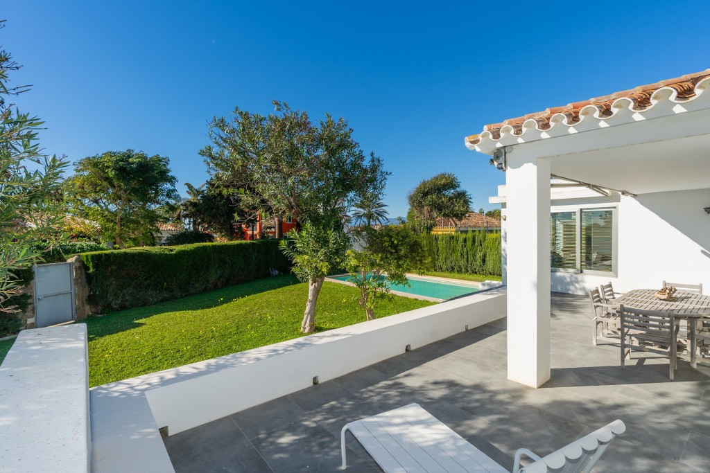 Large villa on one level literally on the the beach in Playas Andaluzas in East Marbella. The house offers a master bedroom with walking closet, office and bathroom, two more bedrooms sharing a bathroom, a modern kitchen open to the dining and living room with access to the beautiful terrace and garden with sea views. Amazing pool with outdoor toilet. Parking area for two cars. In the lower level there is a bedroom used as utility at the moment and a bathroom. Unbeatable location with still potential to increase the house with an upper level.
