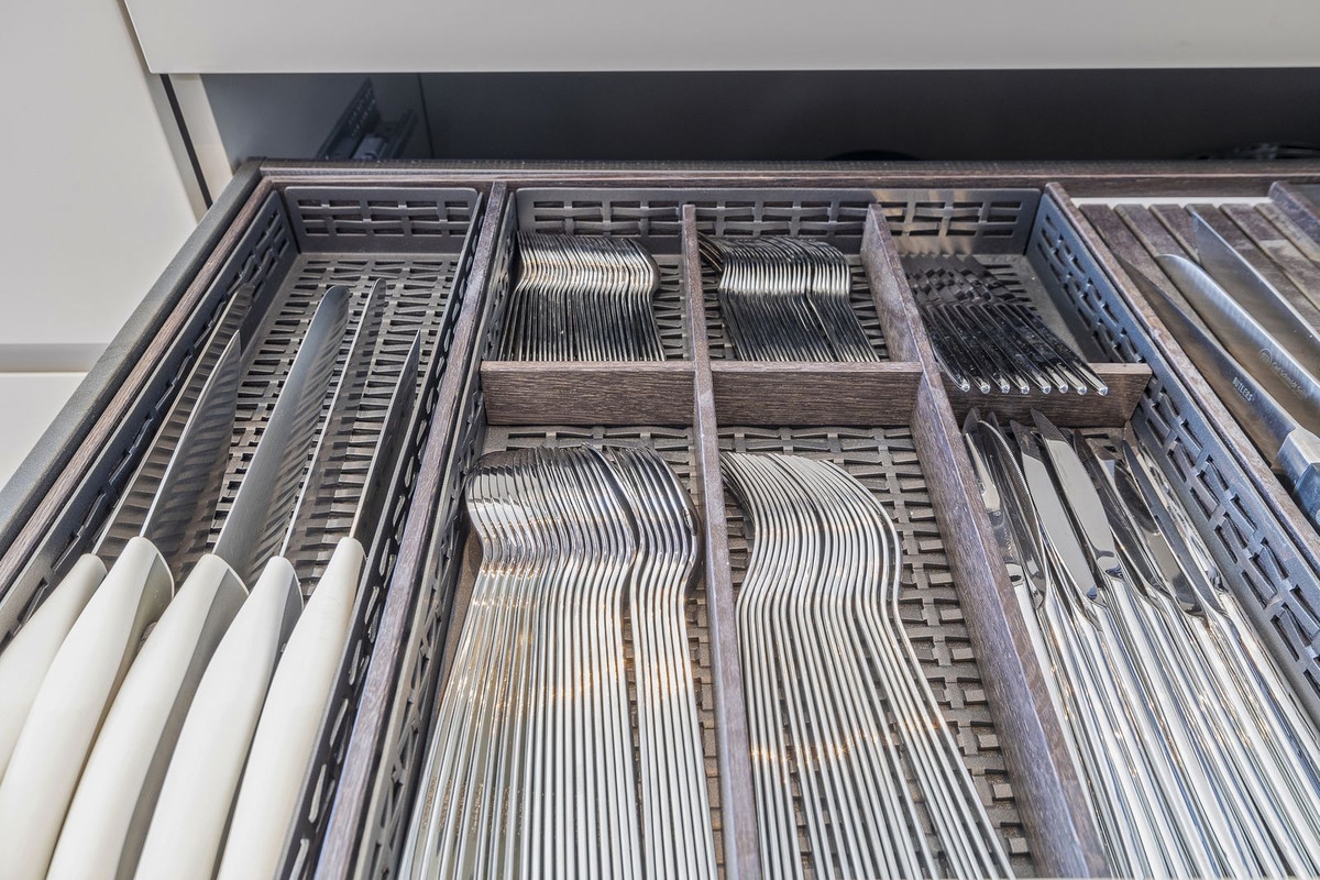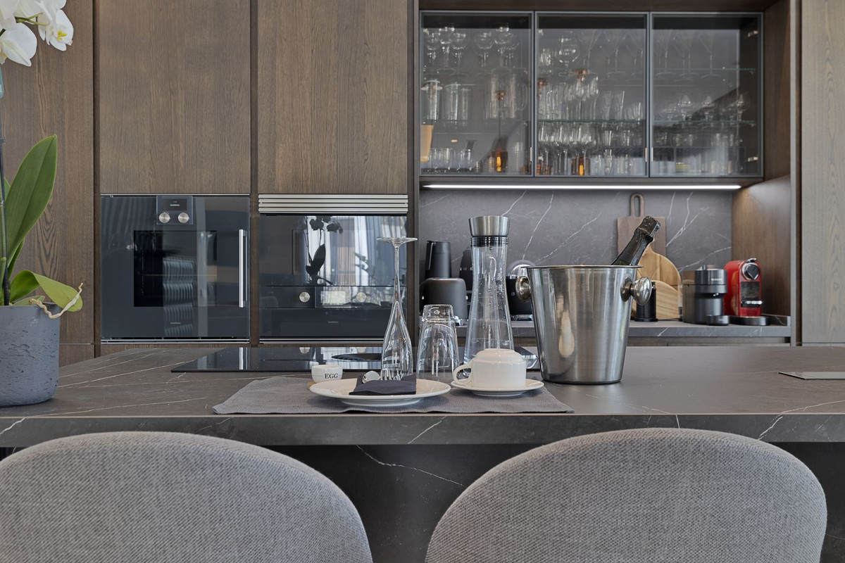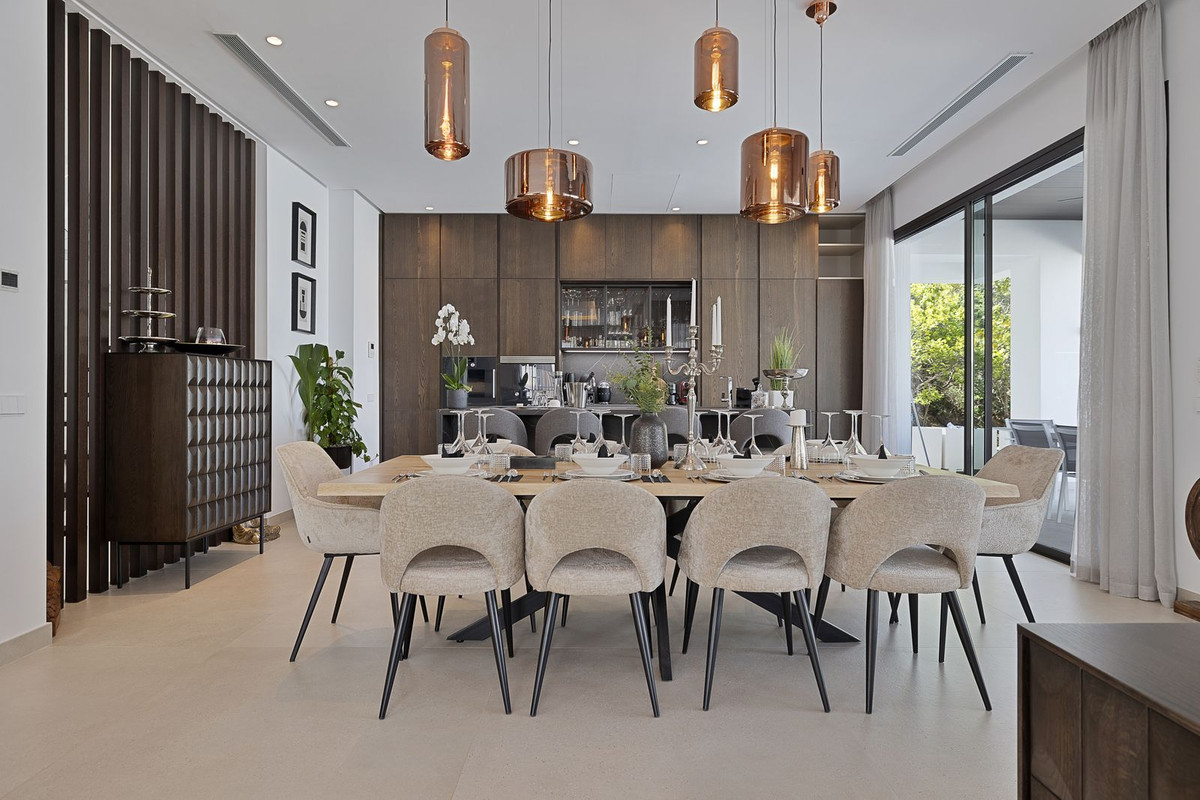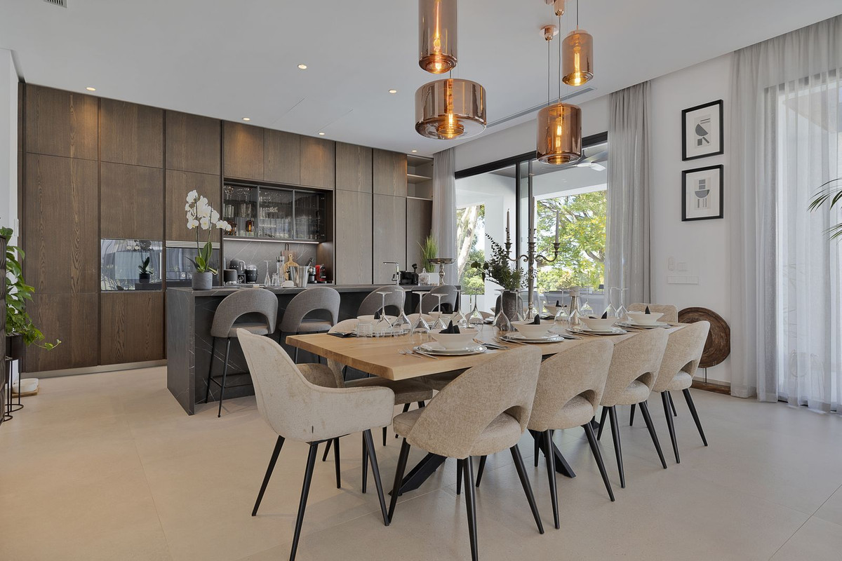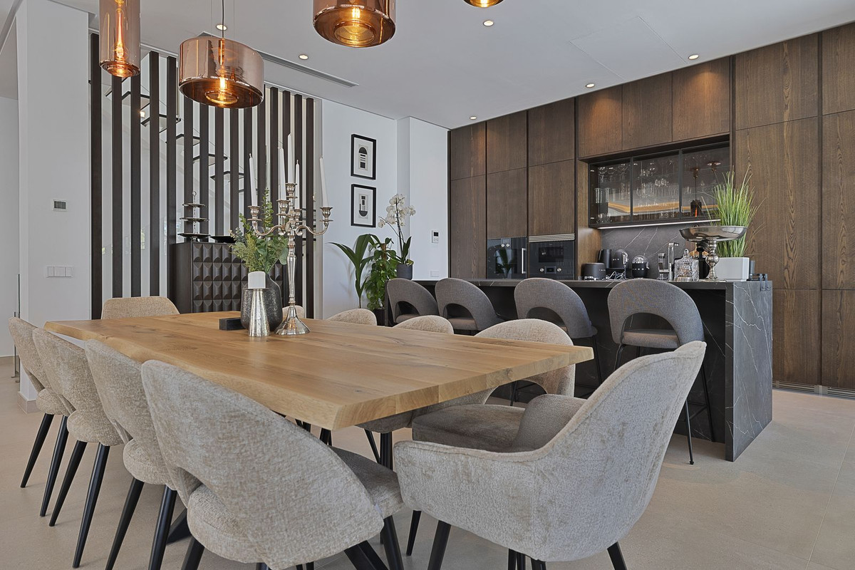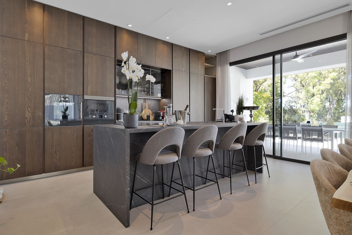 The ground floor living area is luxuriously equipped and designed for indoor/ outdoor living with seamless access to the gardens, terraces and pool deck and a variety of areas for lounging, dining, and enjoying life around the pool deck or in the heated saltwater infinity pool, with crosscurrent trainer. The main lounge area, dining room and kitchen are spacious and open plan and the Porcelanosa kitchen with Gaggenau appliances is completely equipped with all accessories you would expect in a luxury home including Nespresso and various other coffee machines, juice press, juicers, blenders and mixers.
