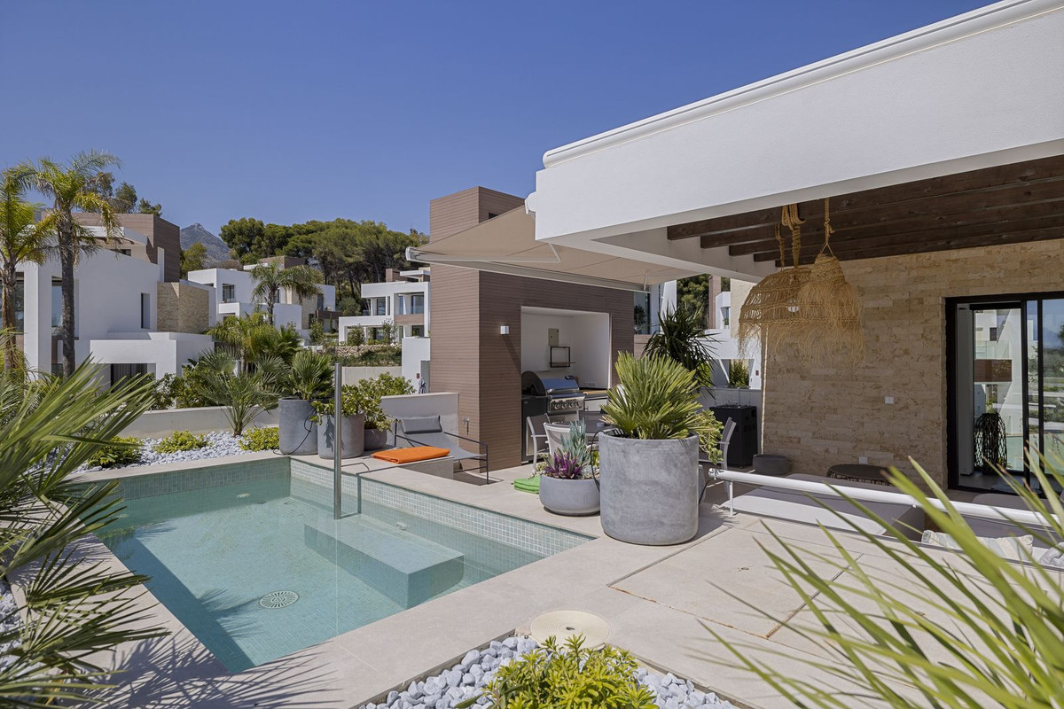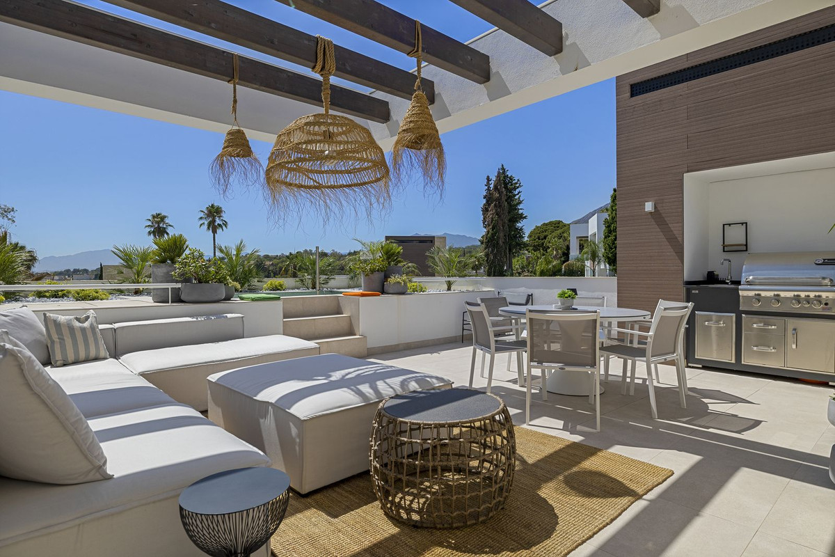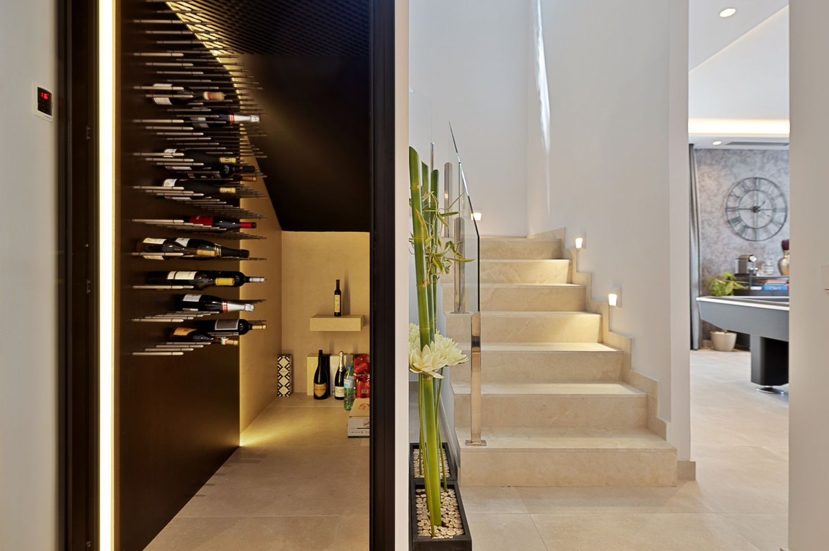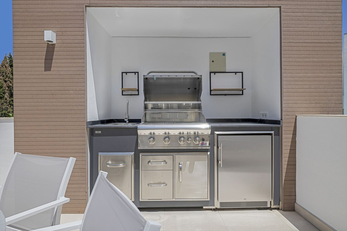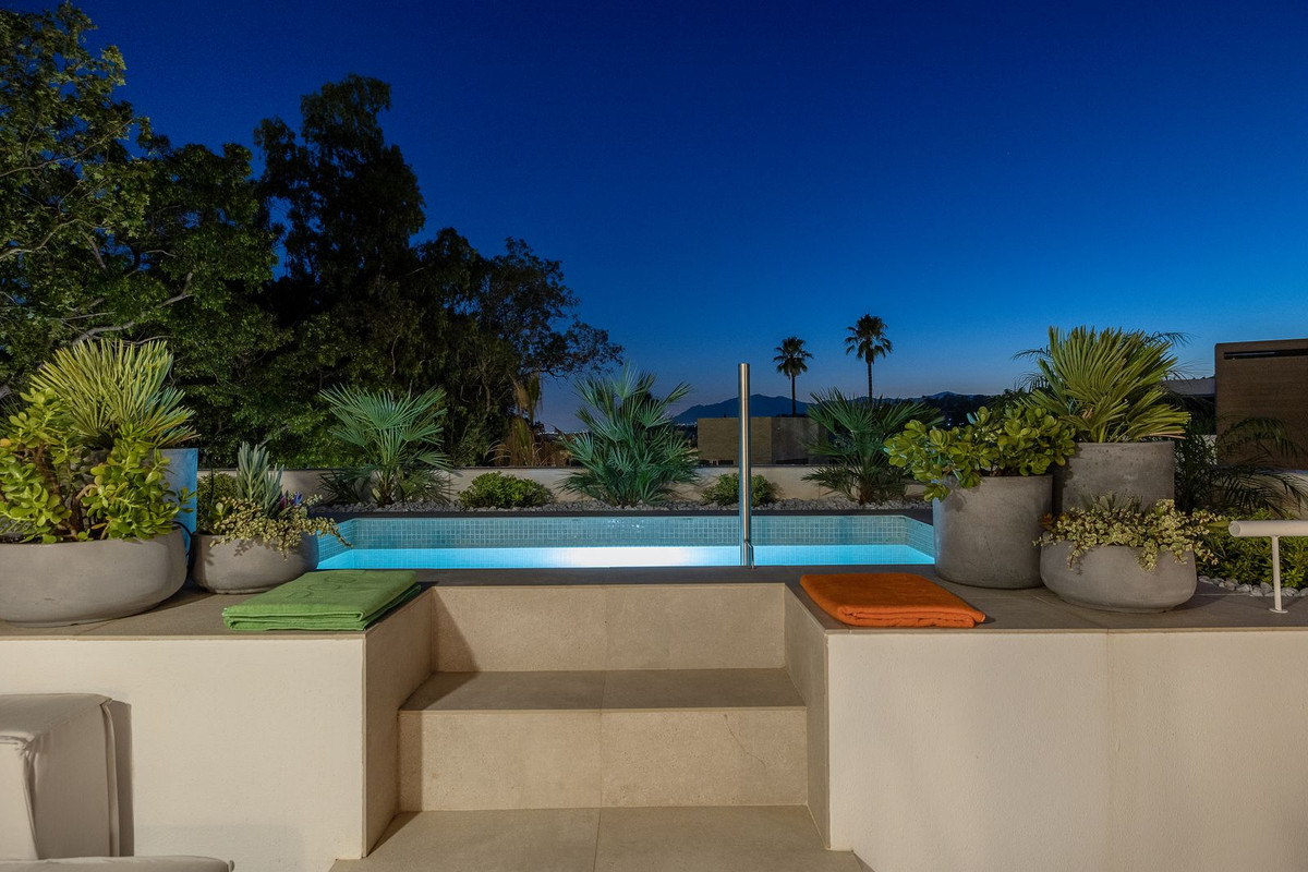 The solarium level is an oasis. Views to the lush green surroundings of the Marbella neighbourhood and La Concha mountain with a sea glimpse. Accessed by elevator or by stairs directly from the house and luxuriously equipped with chill out area, heated pool, dining area, full outdoor kitchen with Landmann Ardor Professional grill with ceramic infrared and rotisserie burner, Liebherr fridge and sink with hot and cold water tap. To protect you from the Marbella sun there are extensive automatic awnings.