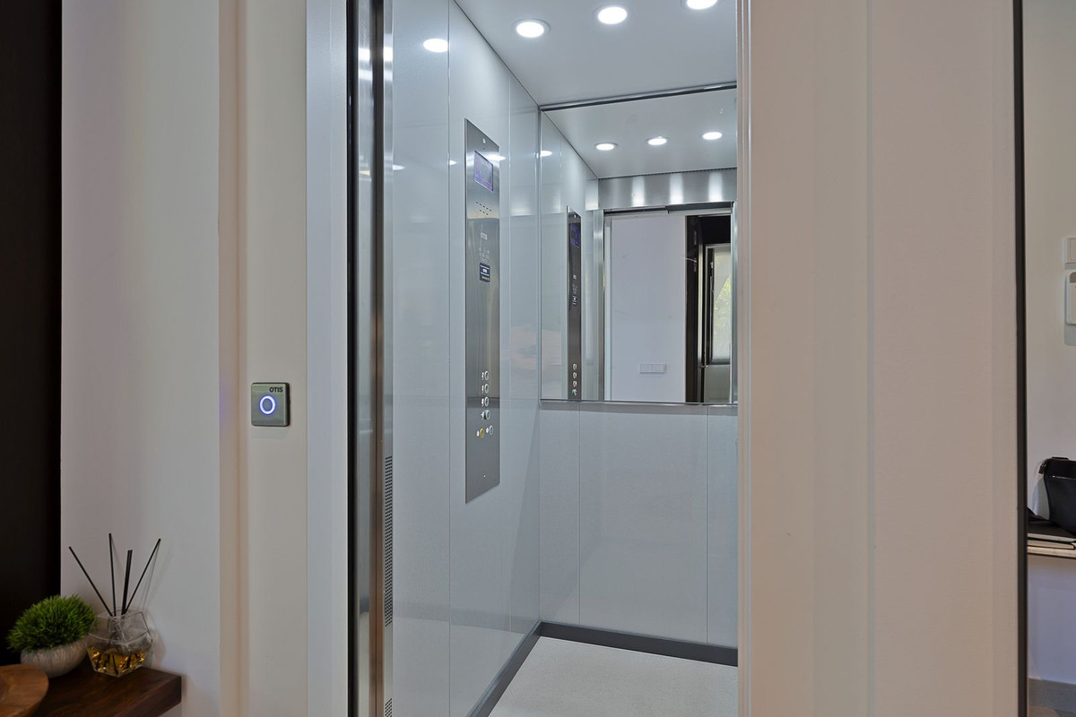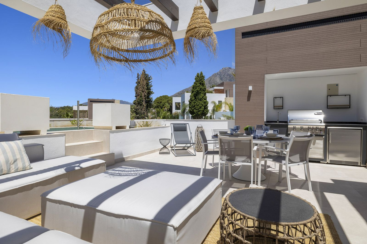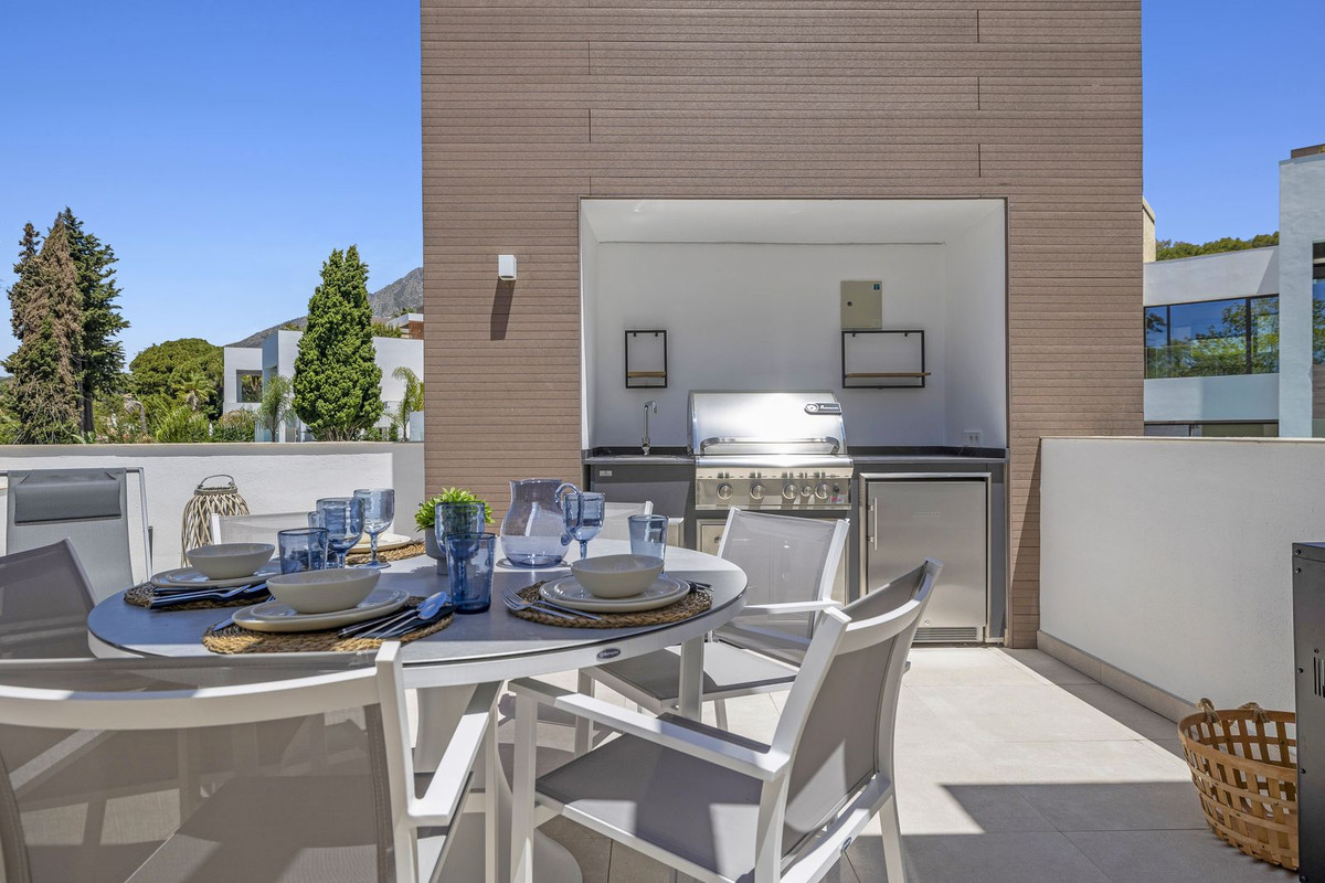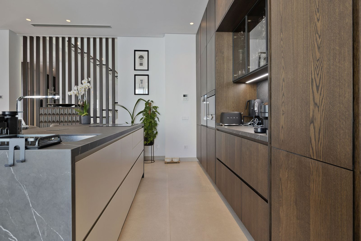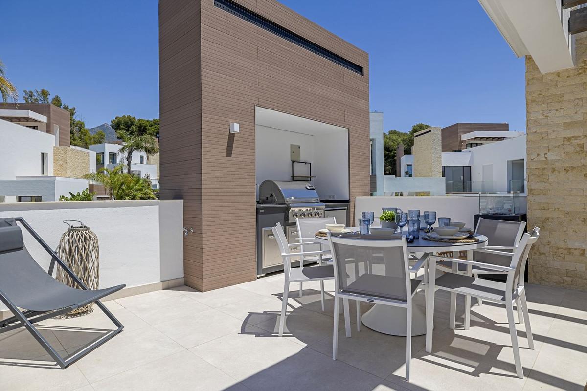 The solarium level is an oasis. Views to the lush green surroundings of the Marbella neighbourhood and La Concha mountain with a sea glimpse. Accessed by elevator or by stairs directly from the house and luxuriously equipped with chill out area, heated pool, dining area, full outdoor kitchen with Landmann Ardor Professional grill with ceramic infrared and rotisserie burner, Liebherr fridge and sink with hot and cold water tap. To protect you from the Marbella sun there are extensive automatic awnings.