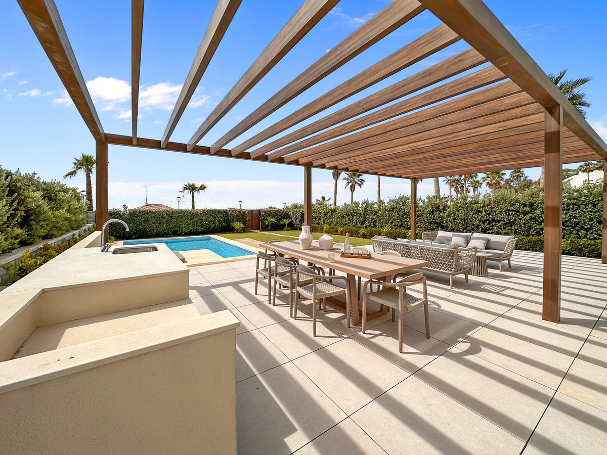 The interior and exterior spaces are joined by double-glazed windows that go from floor to ceiling, thus generating a feeling of continuity and connection with nature. The spacious terrace features the chill-out, barbecue area with outdoor kitchen and dining space. In the garden one can enjoy the heated jacuzzi and the swimming pool, surrounded by perfectly manicured lawns and the wooden platform for sunbathing. All this, in the much desired south orientation. There's a direct access gate to the beach.