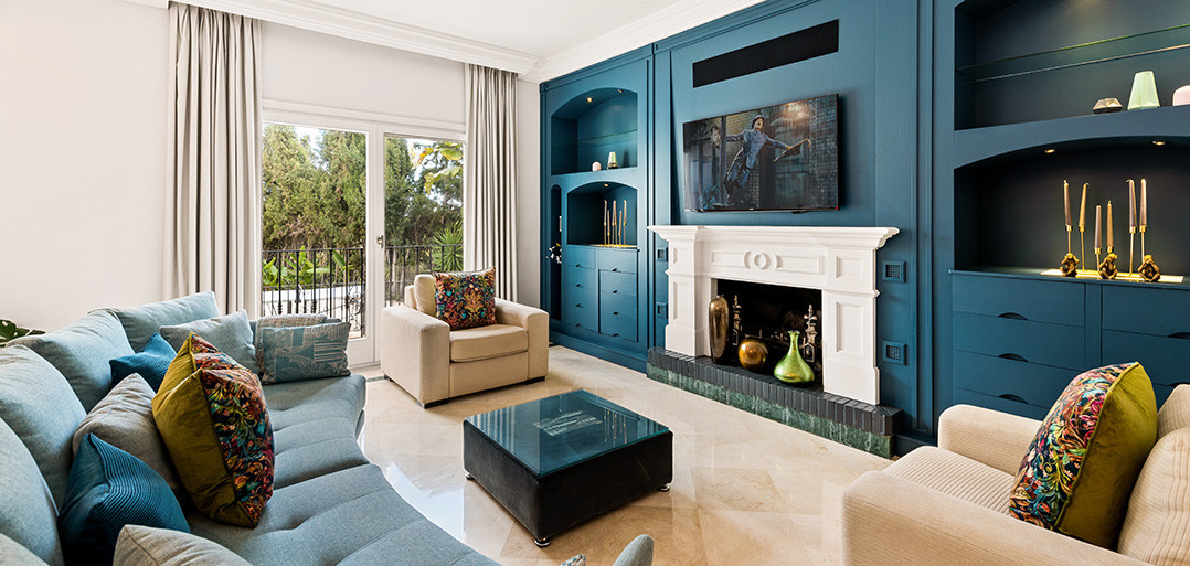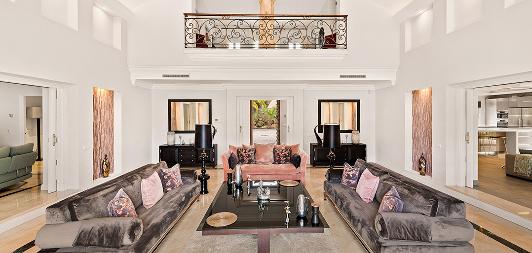 Entering through electric double gates a long sweeping drive leads to the front porch of this elegant spacious property. One is immediately met by the outstanding views from the double ceiling height hallway with a feature staircase taking to an upper TV den and the first floor two double bedrooms suites both with vaulted ceilings and access to private terraces. The main floor offers a further two double bedroom suites, a tall ceilinged formal drawing room, a cosy library with open working fireplace and a vast American style family kitchen incorporating a formal dining area, sitting area and high gloss trendy kitchen with large central breakfast island and an abundance of kitchen appliances. From the kitchen doors lead to a covered exterior dining room with steps to the garden and from the reception rooms patio doors open onto a large covered lounge terrace.
