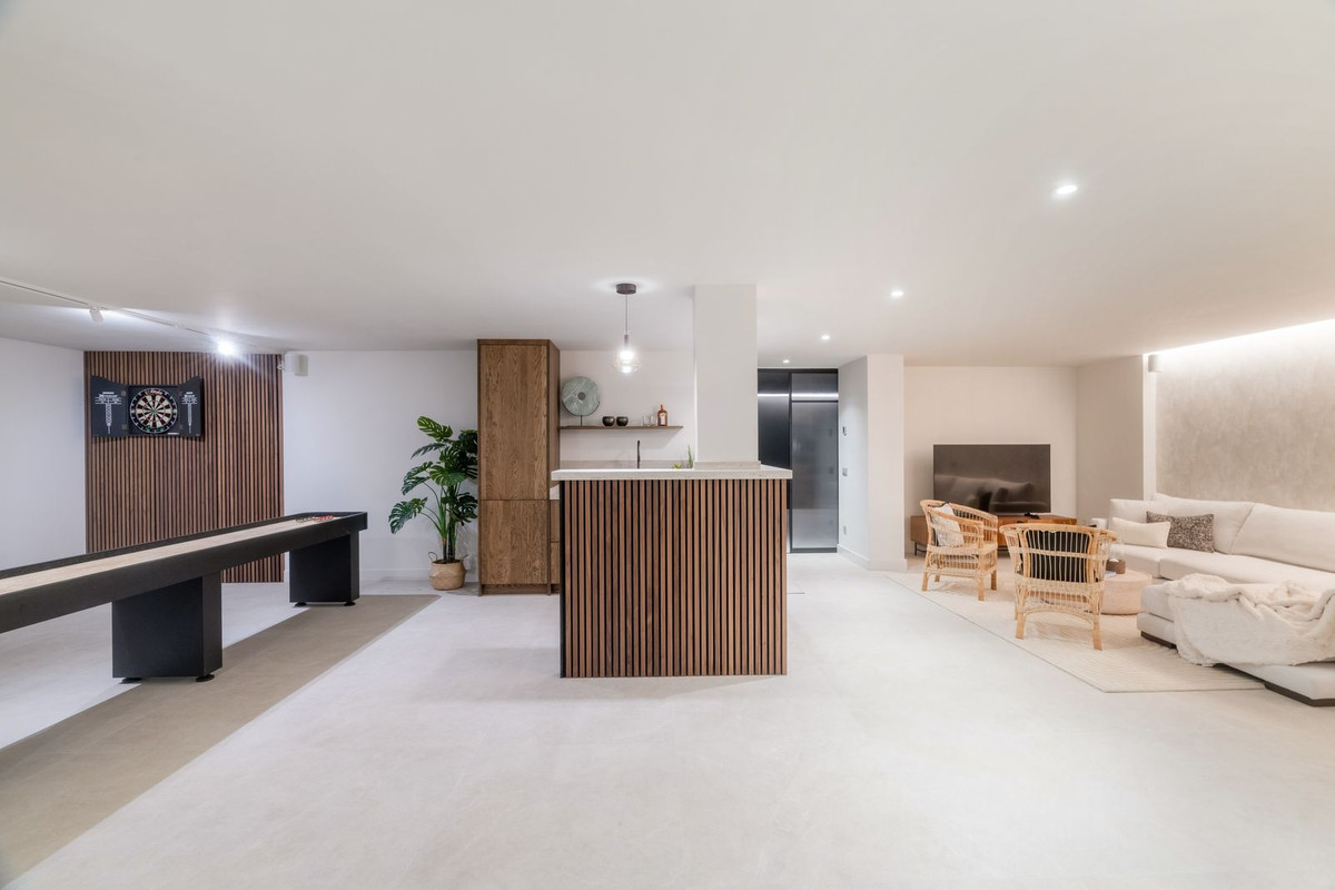 On the lower level, the home transforms into a full-scale entertainment and wellness retreat, complete with a custom bar and lounge, a private cinema room, and a dedicated spa area featuring a traditional hammam, Finnish sauna, plunge bath, and dual rain showers — bringing the full luxury experience into your everyday life.