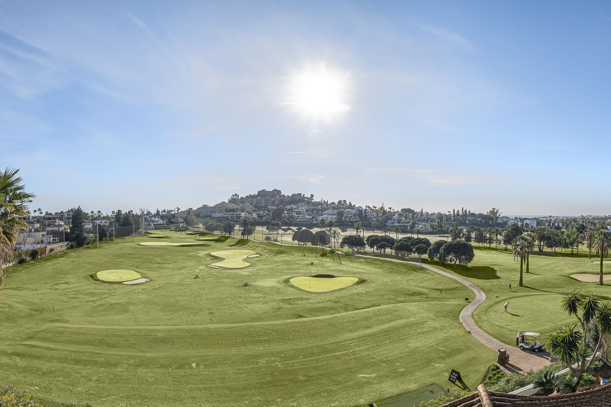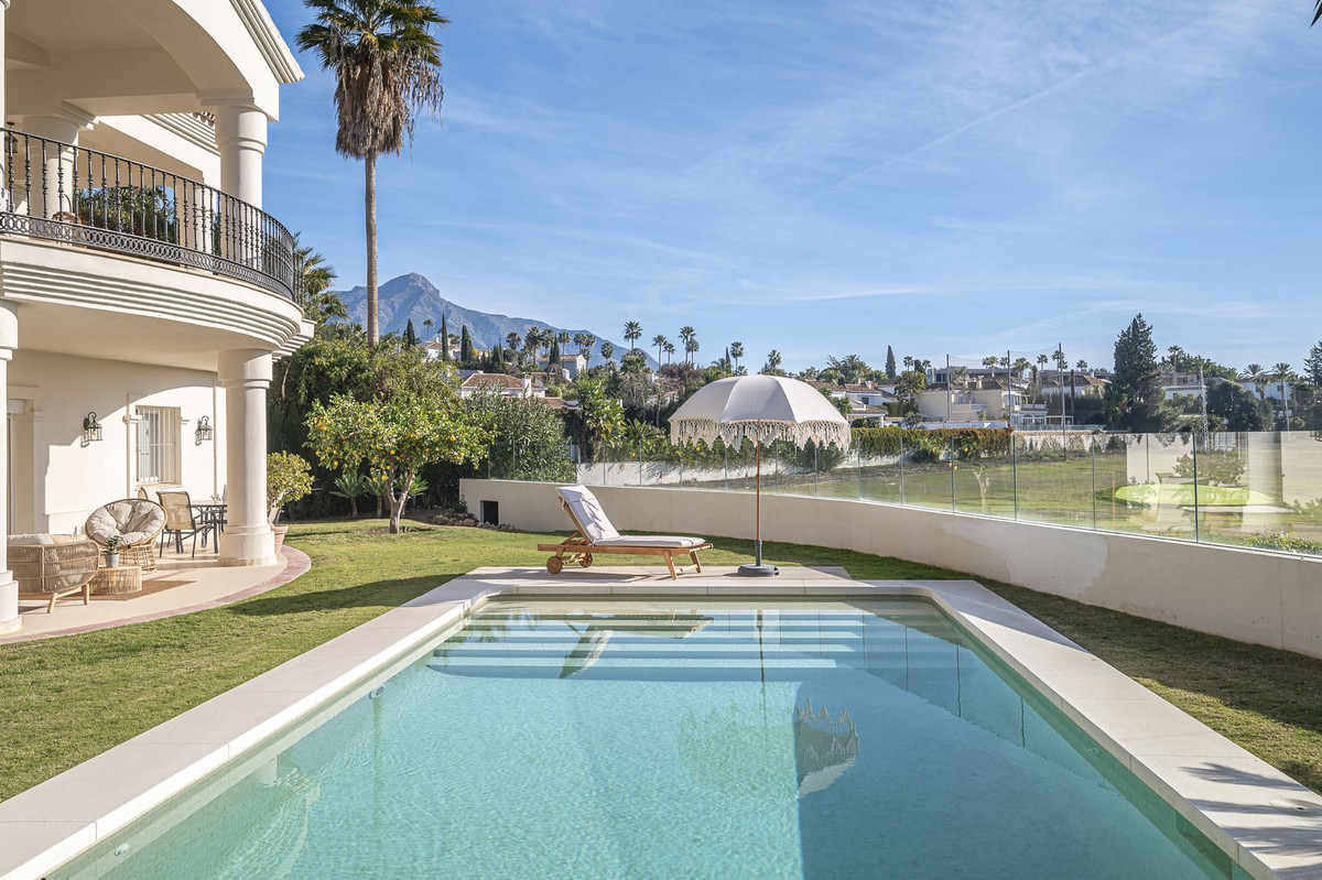 This magnificent villa located in the heart of the prestigious Golf Valley of Nueva Andalucia! This impressive property boasts of an expansive 1.425m2 of plot size and located first line golf. Entering the property, a huge driveway welcomes you to the well-maintained expansive garden area. This recently reformed villa has is divided into 4 floors plus attic, 7 bedrooms, 7 bathrooms, gust toilet, several living rooms and lounge areas, terraces and entertainment area. Upon entering this stunning villa, you will be greeted by a bright hallway with a high ceiling and access to the different areas of the main floor. To the right is a bedroom with ensuite bathroom which could also be an private office.On the left part, you will find a charming independent kitchen fully equipped with high quality appliances. Also, on the main floor you will find the dining area, a separate lounge area and a very chic sitting area with direct access to the terrace. Enjoy the best golf views on the large terrace with different spaces to have your meals or just relax and enjoy the sun and the fantastic views. Going up on the second floor, you will find two grand master bedrooms both with ensuite bathrooms (with bath and shower), both with access to the bright terrace. On the upper floor, you will find a spacious studio which could be used as an office, art studio, another bedroom etc. Going down to the lower floor, you will find, a spacious entertainment room with a cinema, bar, game area; 3 complete bedrooms and 3 bathrooms, a spacious living area-dining room and an open kitchen. We go out to the sunny porch area that leads out to the lush gardens with a beautiful swimming pool. On the lower floor, you will find a very spacious garage for 5-6 cars and a fully equipped gym area. This modern house is equipped with a lift in all floors, individual air-condition hot and cold, fireplace, underfloor heating, alarm system, electric blinds. This classic-style home is built with the best quality materials and modernized elegantly creating a luxurious home in one of the most exclusive areas of Marbella! Surrounded by the best golf courses such as Los Naranjos Golf, Magna Marbella, Las Brisas. Just a few minutes’ drive to the beach and Puerto Banus!