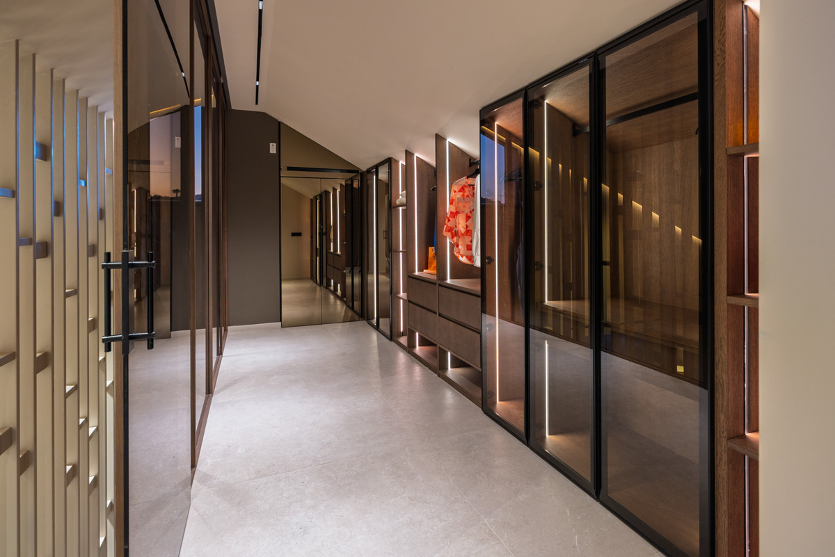 INTERIOR The sloping ceilings and large windows flood the spaces with natural light. The interior design combines clean lines and natural finishes in neutral tones with noble materials, creating an atmosphere of serene elegance. The architectural layout favours a perfect integration between the interior and exterior spaces. Upon entering the property, you will find spacious, bright, and welcoming living areas with high ceilings, which share the limelight with the fully equipped kitchen.