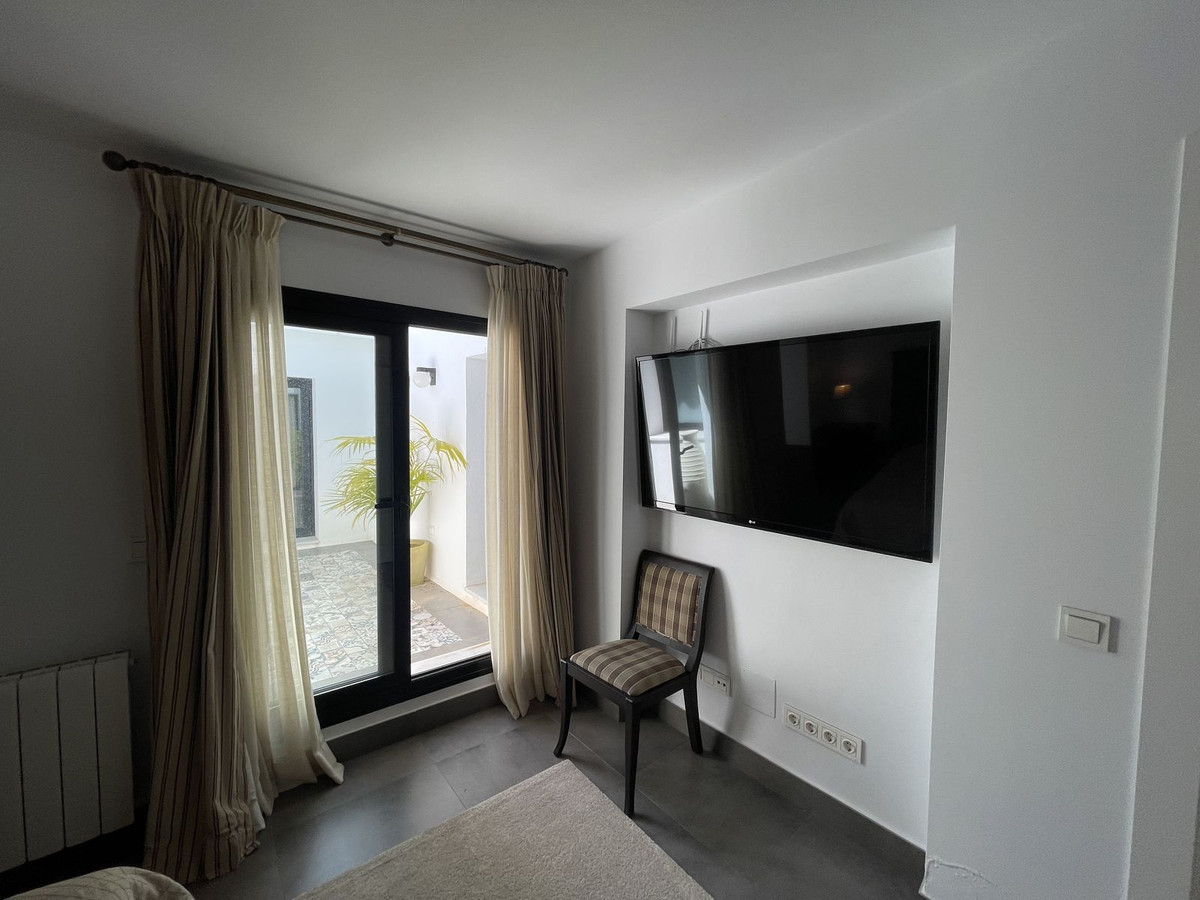 The villa has three bedrooms, each with an en-suite bathroom, arranged around a charming interior patio that provides a touch of serenity and privacy. It also has a laundry area and built-in wardrobes that add functionality to the space.
