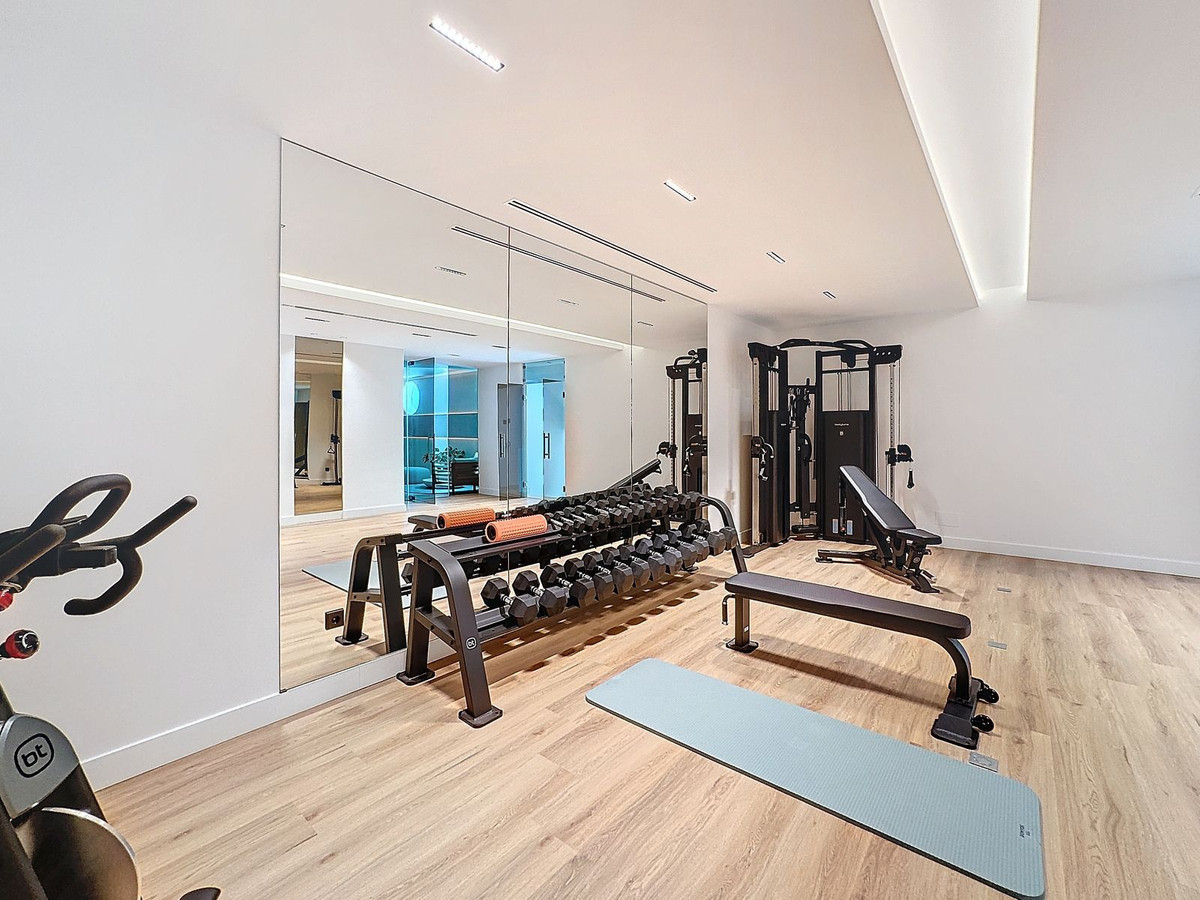 Professional gym with natural light and underwater views.
