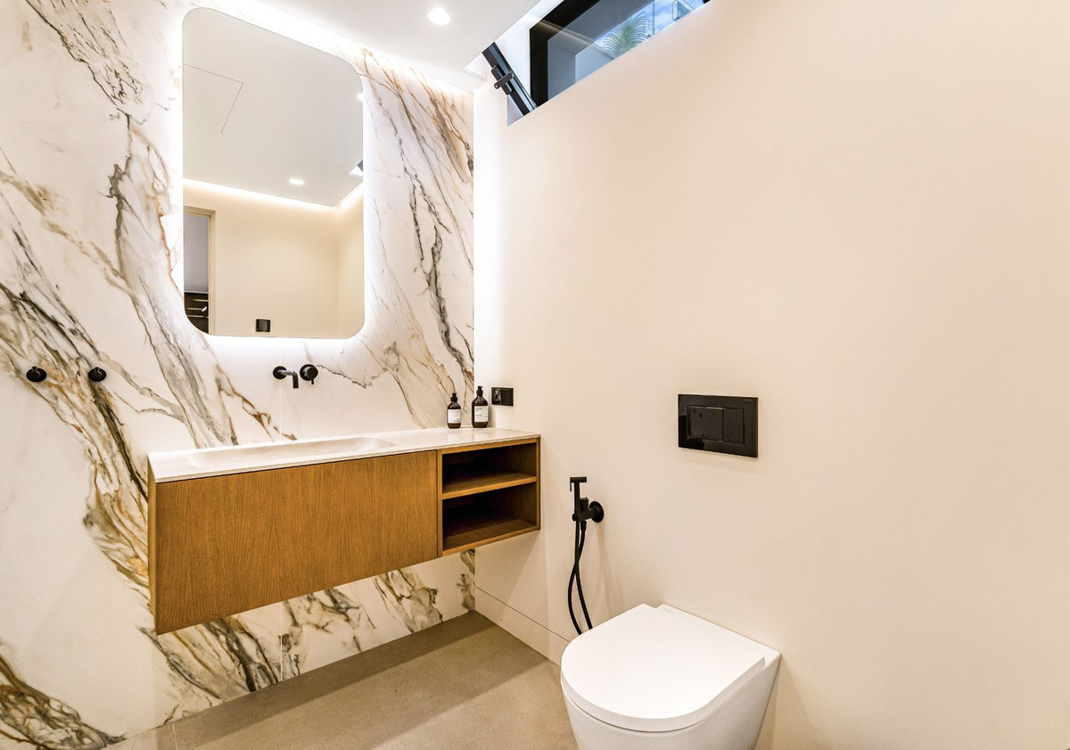 The upper level houses the impressive master bedroom with an en-suite bathroom and direct access to a spacious private terrace, offering panoramic sea views. Two additional bedrooms share a bathroom and have direct access to the terrace, providing bright and comfortable spaces for residents.