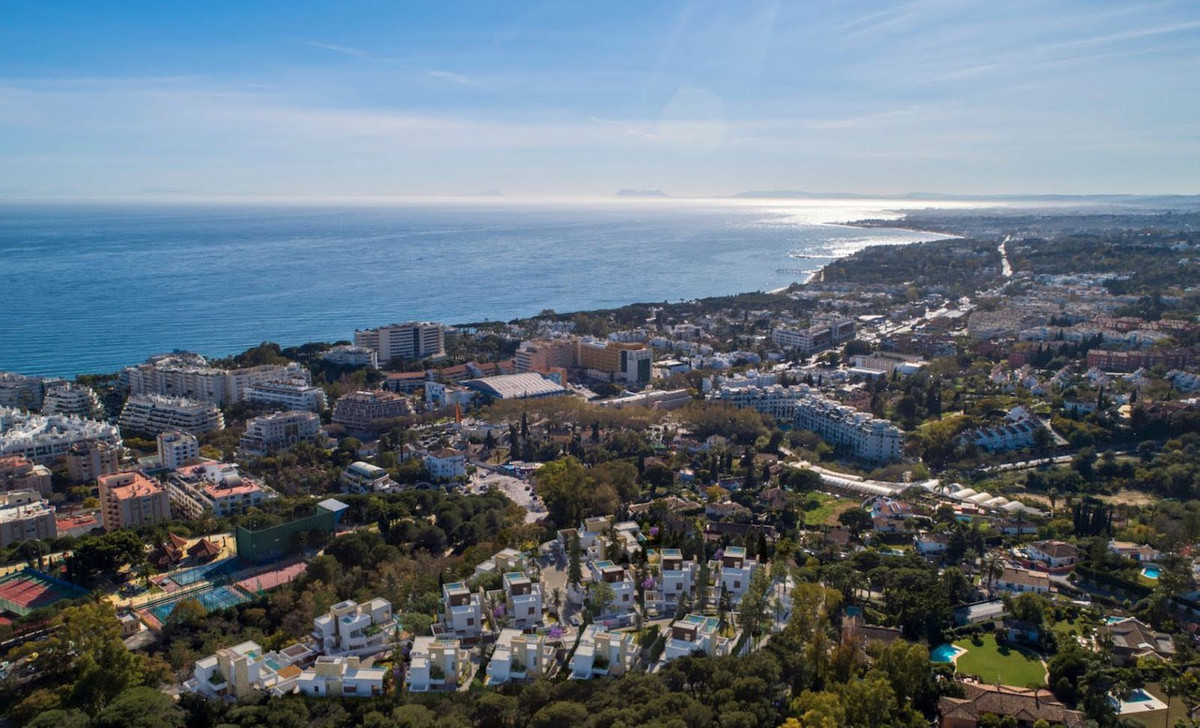 Modern luxury villa of exceptional qualities is located in a gated community, consisting of only 15 villas, with 24 hour security guards and concierge services situated in a green oasis on the edge of the famous Golden Mile and just a few metres from the beach, a few minutes walk from the historic old town. With a plot of 1000m2, a total living area of 730m2, large terrace of 225m2 and includes 5 bedrooms and 5 bathrooms, a spacious living room, an open plan kitchen equipped with the highest quality furniture and appliances, a private lift connecting each level of the property, cinema, sauna and hammam, under floor heating, a rooftop solarium with beautiful views towards the sea and private garage for 2 cars + 2 parking spaces. Both the garden and pool will be centrally maintained by the community for a carefree lifestyle. Construction of the villa is finished.