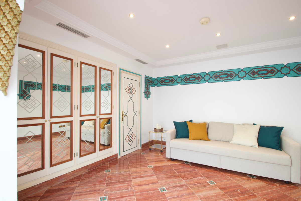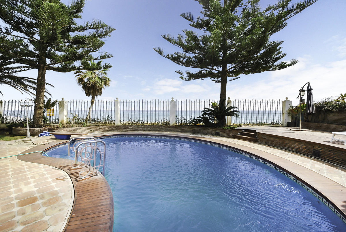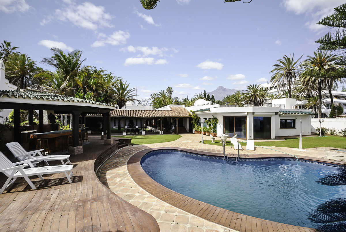 A very spacious & unique villa situated in an unrivalled front line beach position in one of Spain's most privileged location, Marbella's exclusive Golden Mile. The villa is set on a double plot and offers on the ground level an entry hall, a guest toilet, office, spacious living room leading onto the garden with various terraces, swimming pool, bar, and direct access to the promenade. On this floor there is a separate dining room with vaulted skylight ceiling, a fully equipped kitchen with separate entrance, the master suite with walking wardrobes, 2 further double en suite bedrooms, and 2 bedrooms sharing a bathrooms. On this level there are two self contained guest apartments with 2 bedroom suites and living area, as well as a garage for four cars. These apartments are accessed separately form the main house. On this level we will also find a separate area with cinema room, an industrial kitchen with storeroom and 2 toilets.