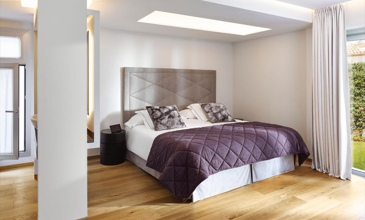 Contemporary 2nd line beach villa in Puente Romano, Golden Mile-Marbella. Built on 2 levels, this property comprises a good size open plan living/ dining room with integrated modern kitchen, fully equipped with top quality appliances and access to a south-facing terrace, garden, and pool. This level offers 2 bedroom suites, one of which with access to the garden. On the upper level there is the en-suite master bedroom with walk-in wardrobes and access to the terrace with breathtaking sea vies; as well as an additional en-suite double guest bedroom. The property is completed by a self contained en-suite bedroom on the ground level with separate access, ideal for staff or guests. Extra features include: under-floor heating throughout; A/C throughout; marble floors; good size swimming pool; alarm system, security blinds, wooden floors, etc. An incredible opportunity on the market to purchase a beachside villa in Marbella’s most desirable resort.
