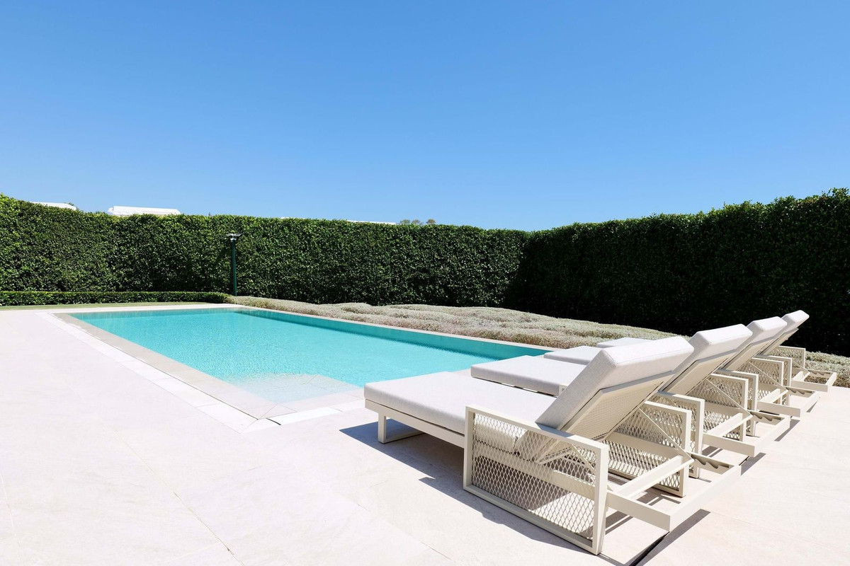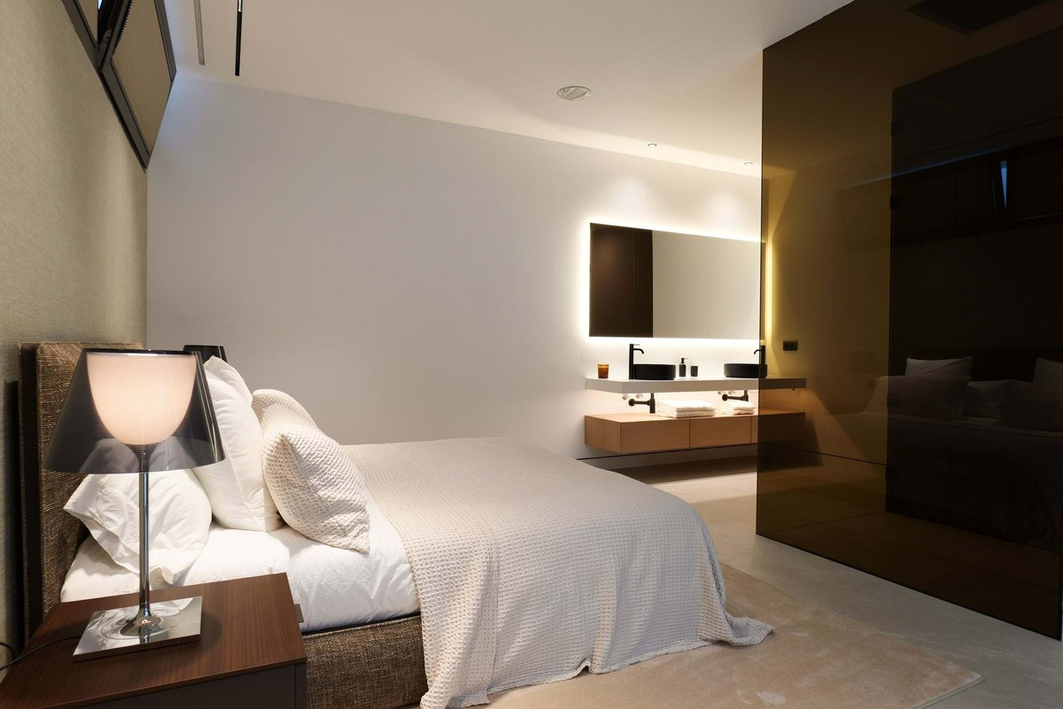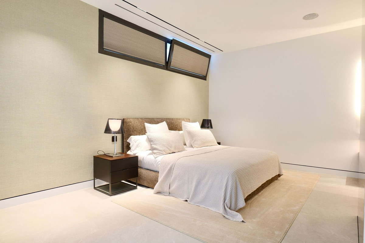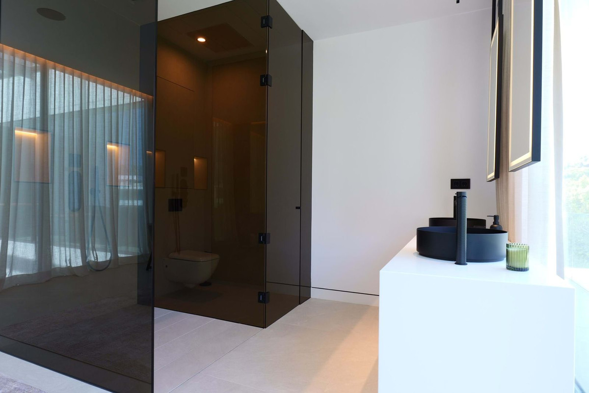 Seamless indoor-outdoor living defines the property. Landscaped gardens of 1,100 m² include two private pools with sea and garden views—perfect for relaxing or entertaining. The ground floor boasts an open-plan living and dining area, flowing into the terraces, alongside a fully equipped designer kitchen. Upstairs, three bedrooms with private terraces enjoy panoramic sea and mountain views. The basement houses a cinema, bar, multi-purpose room, guest suite, laundry area, storage, and a garage for up to eight cars. A highlight is the 100 m² rooftop solarium with pool, dining, and lounge areas, offering unbeatable Mediterranean vistas. Modern comforts include underfloor heating, smart home automation, Dolby Surround sound, and advanced security.