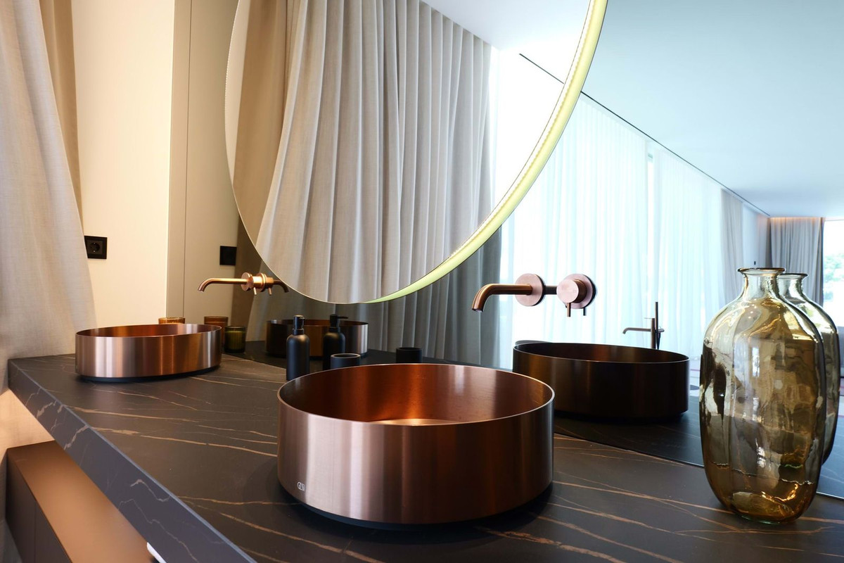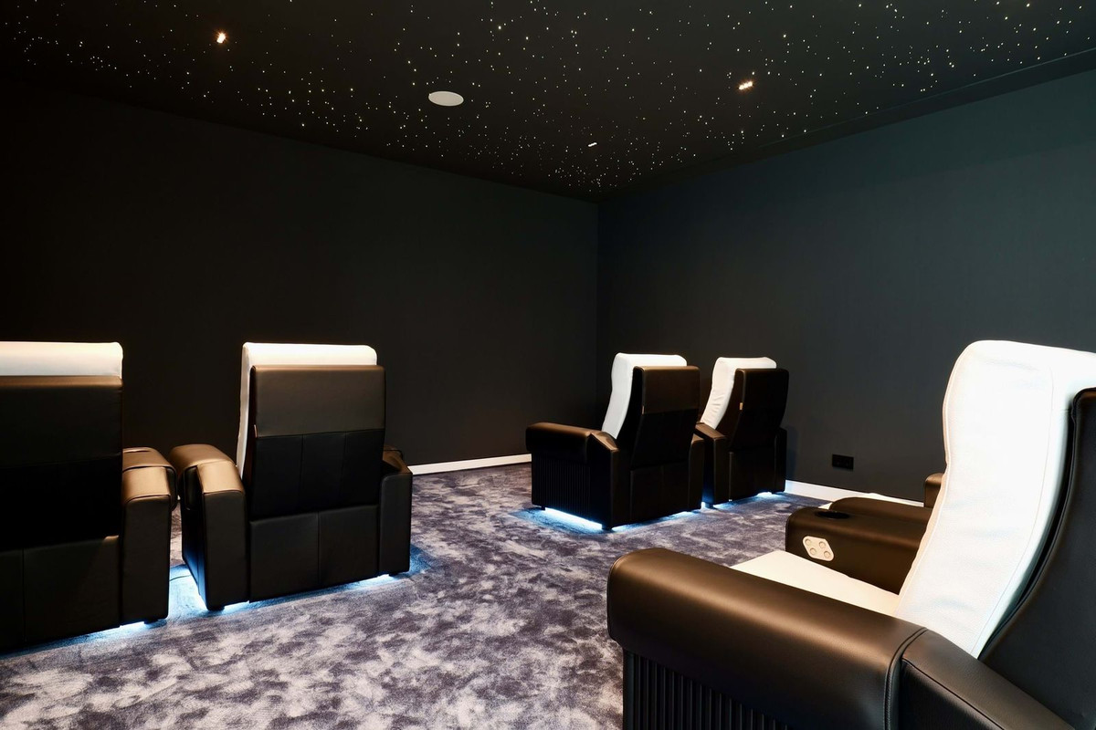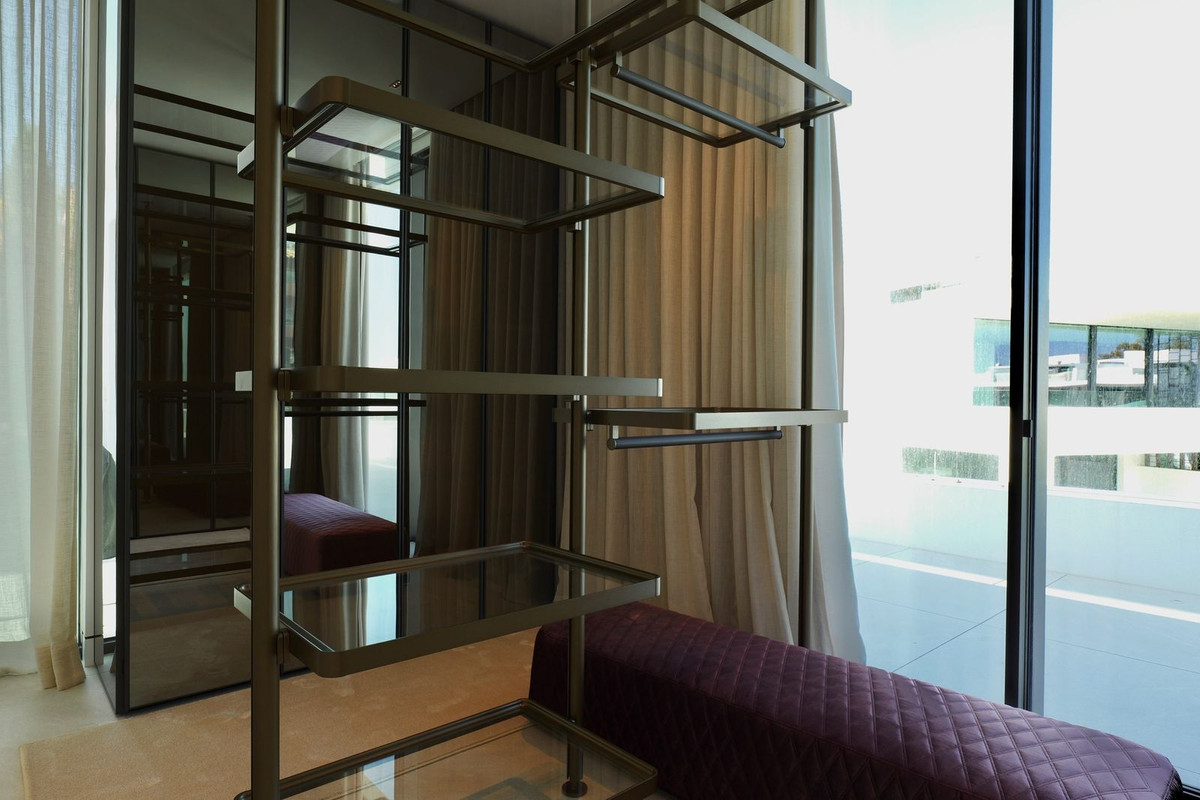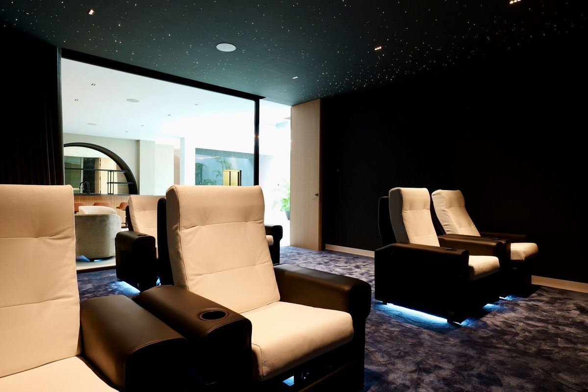 Seamless indoor-outdoor living defines the property. Landscaped gardens of 1,100 m² include two private pools with sea and garden views—perfect for relaxing or entertaining. The ground floor boasts an open-plan living and dining area, flowing into the terraces, alongside a fully equipped designer kitchen. Upstairs, three bedrooms with private terraces enjoy panoramic sea and mountain views. The basement houses a cinema, bar, multi-purpose room, guest suite, laundry area, storage, and a garage for up to eight cars. A highlight is the 100 m² rooftop solarium with pool, dining, and lounge areas, offering unbeatable Mediterranean vistas. Modern comforts include underfloor heating, smart home automation, Dolby Surround sound, and advanced security.