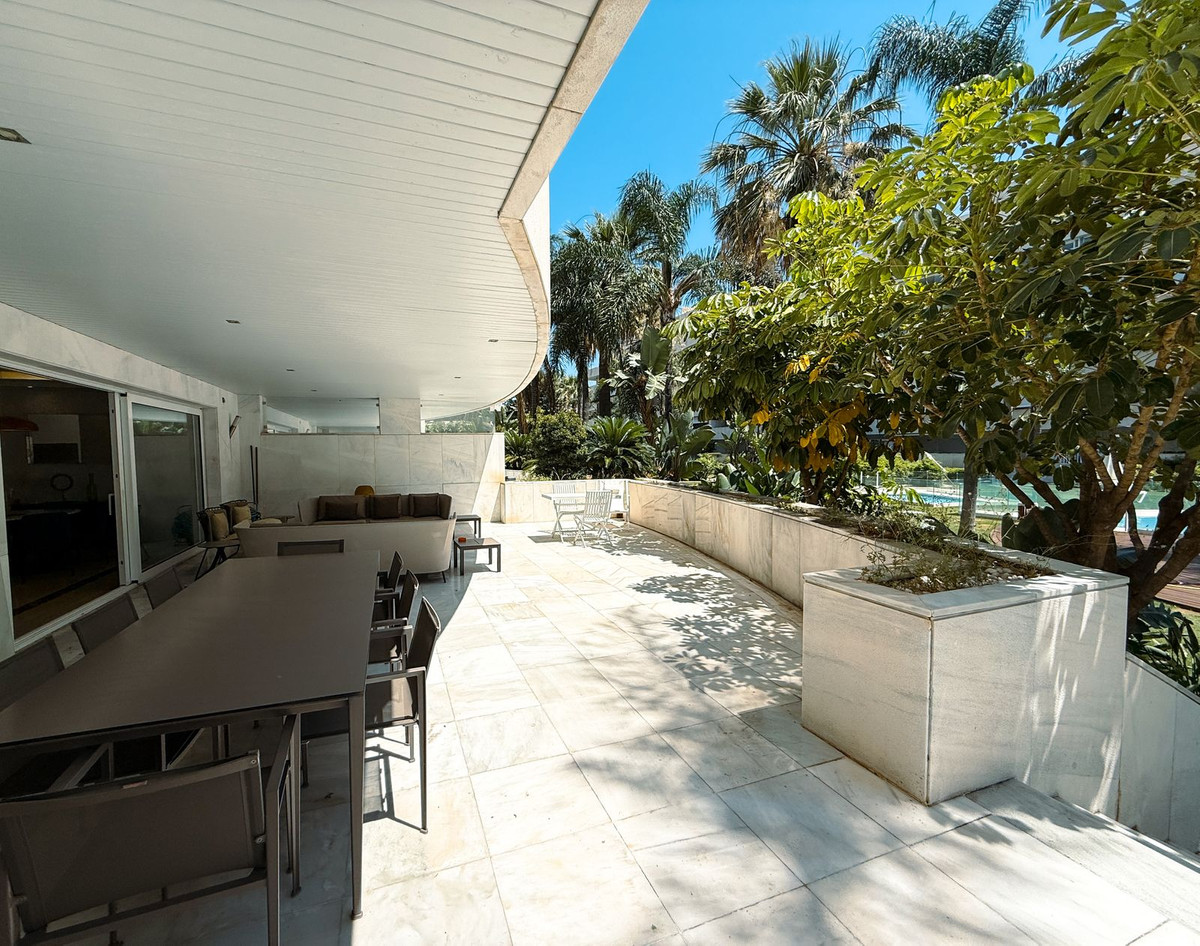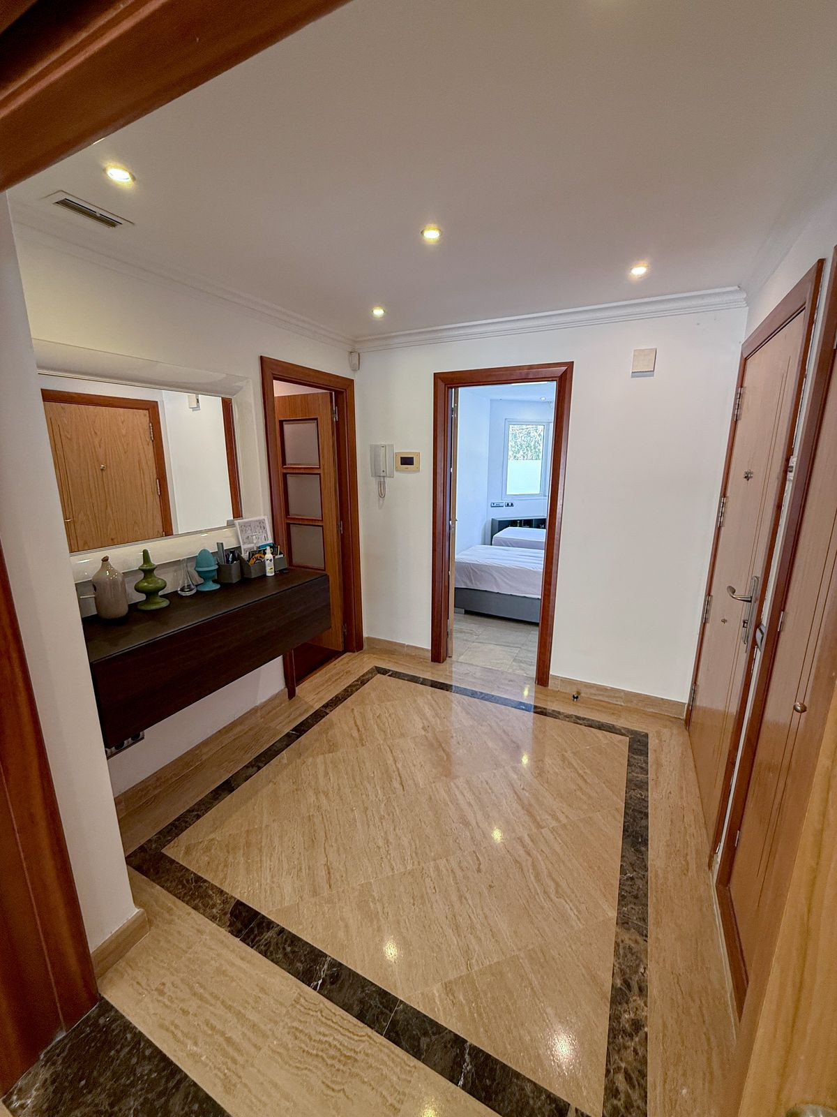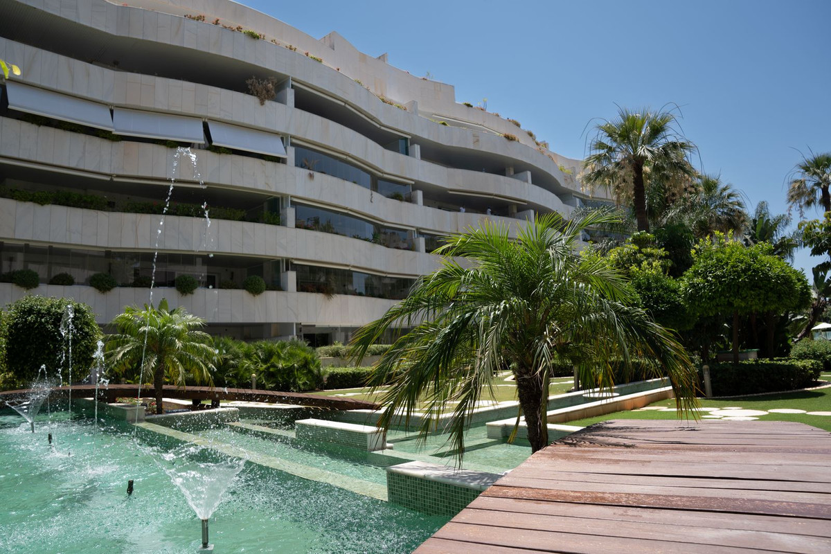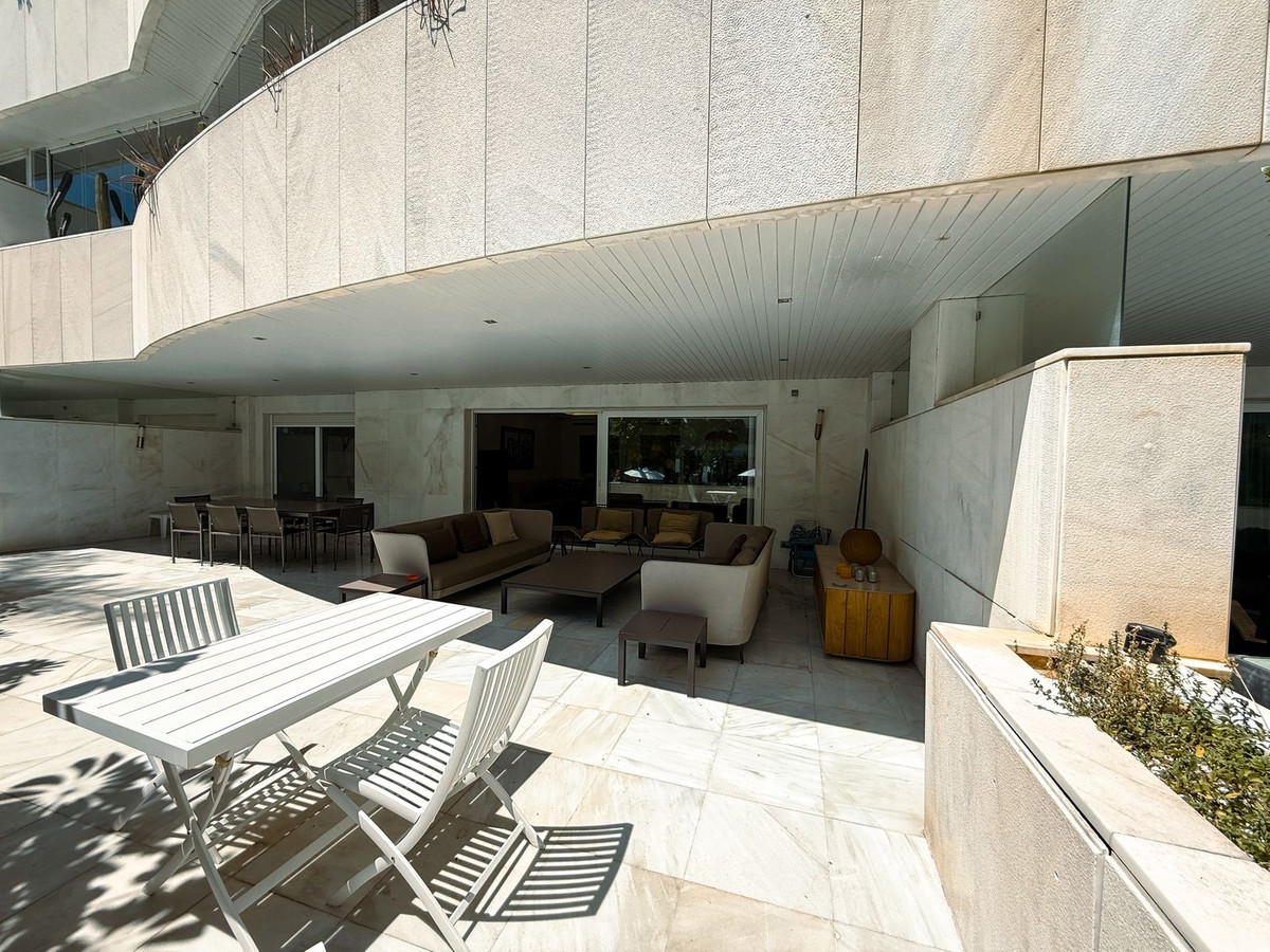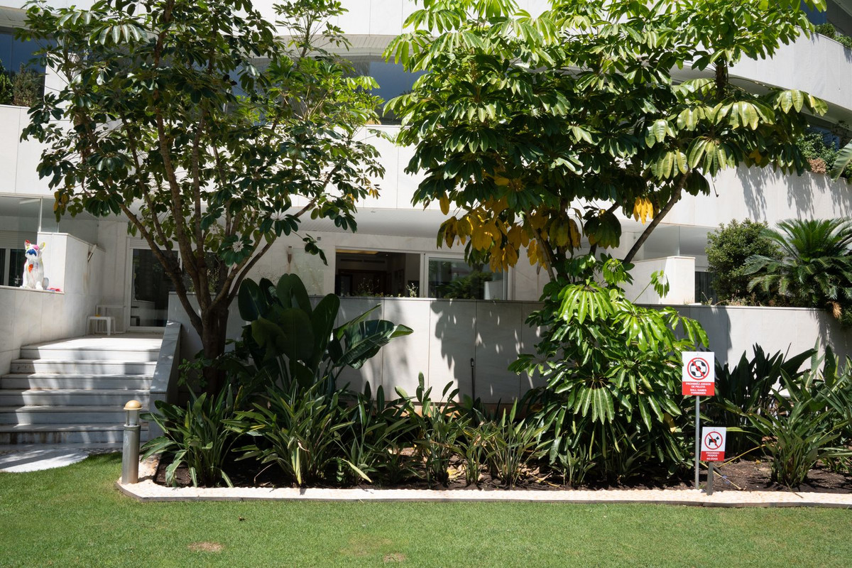 Elegant ground-floor apartment with 157 m² built, located in the prestigious Embrujo de Banús complex, just a 3-minute walk from the beach: Ocean Club, Mistral Beach, etc. Spacious living/dining room with direct access to the terrace of over 70 m².