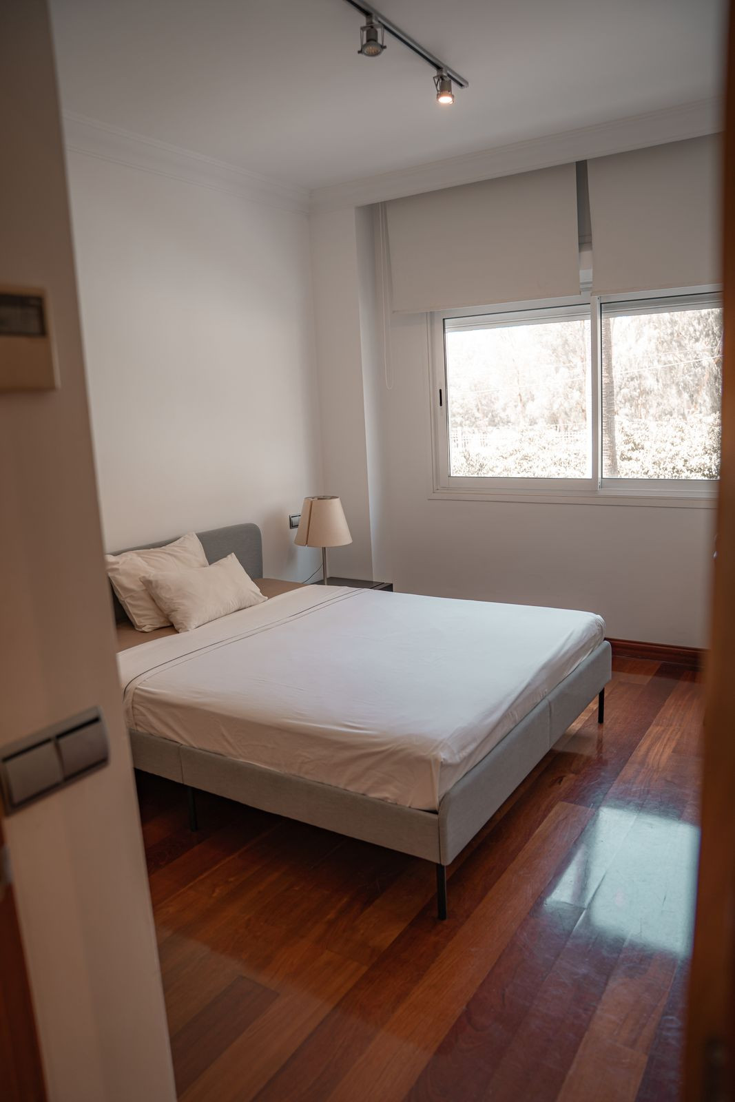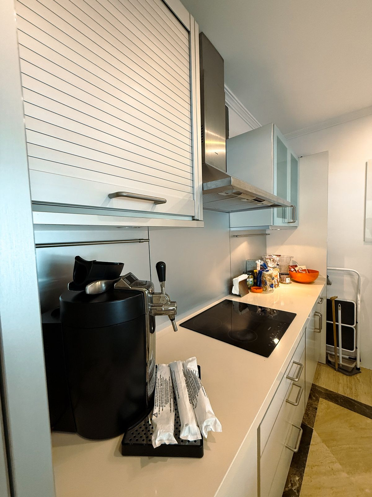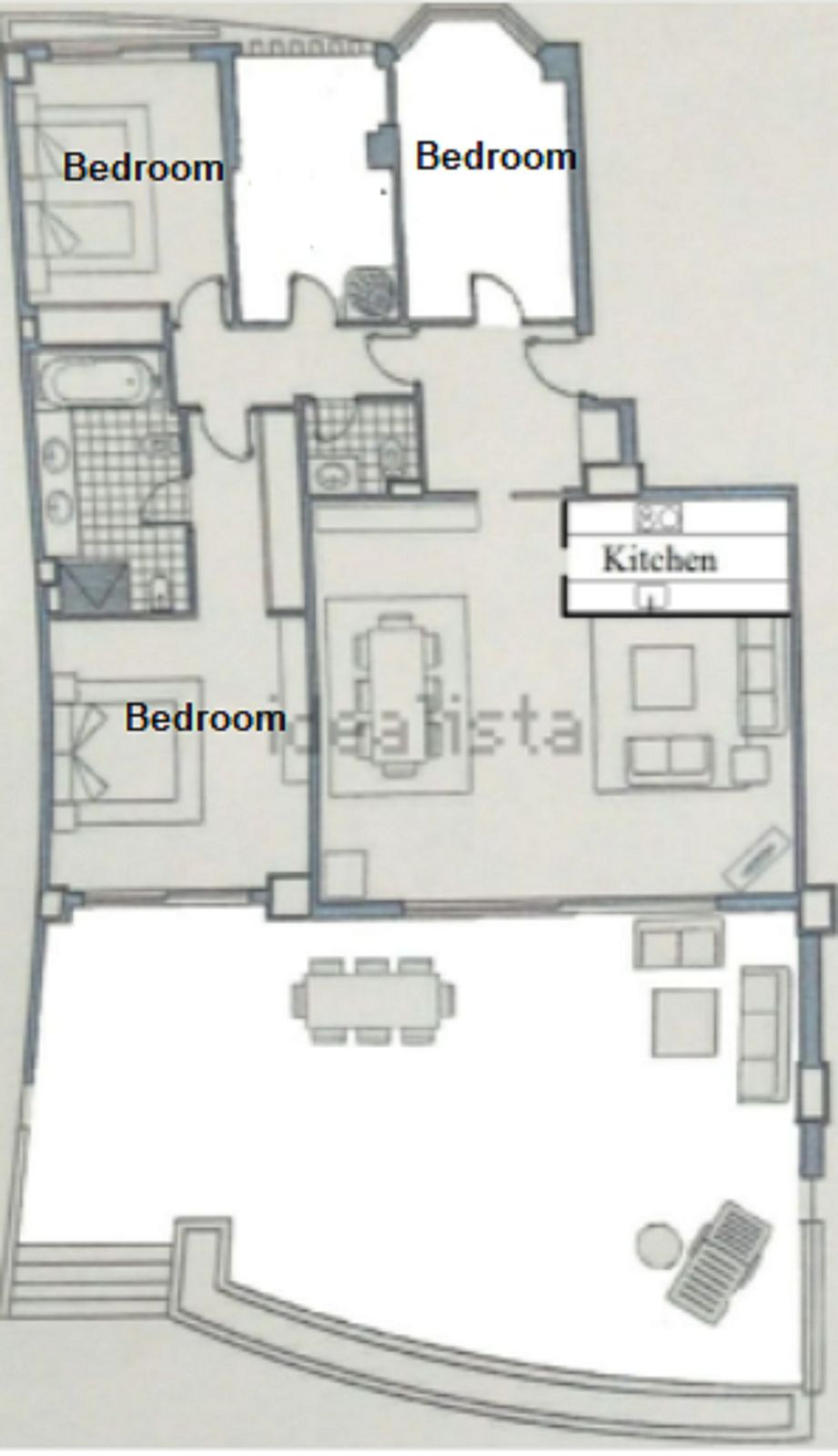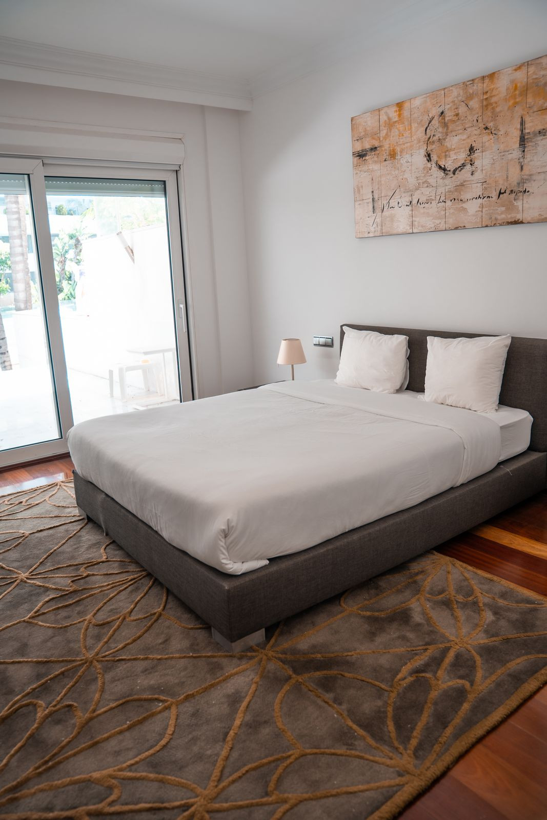 The modern kitchen is fully equipped with high-end appliances. The property offers three bedrooms and three bathrooms. The master bedroom has an en-suite bathroom with a bathtub and shower and direct access to the terrace.