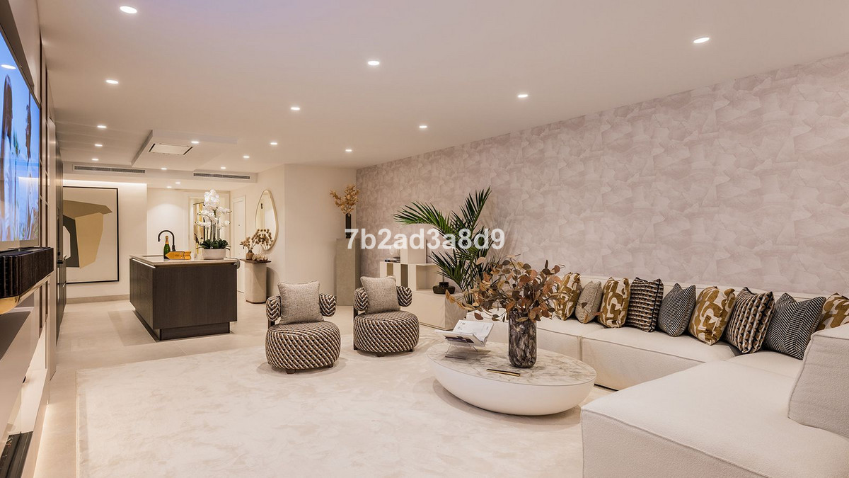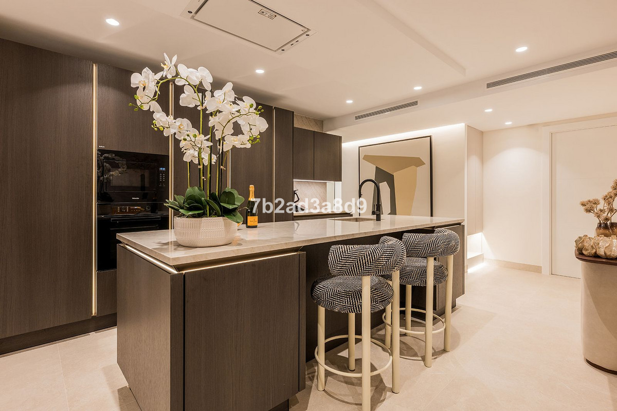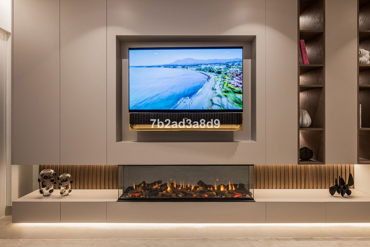 With 186 m² of beautifully designed interior space, this four-bedroom, three-bathroom apartment has been meticulously upgraded to the highest standards. The open-plan layout centres around a designer kitchen equipped with top-tier German appliances, an invisible induction hob and a built-in wine fridge. A second kitchen offers added practicality, ideal for hosting or private catering. Sleek flooring flows throughout, leading to a spacious living area with a contemporary electric fireplace and integrated Bang & Olufsen sound system, perfect for both relaxation and entertaining.