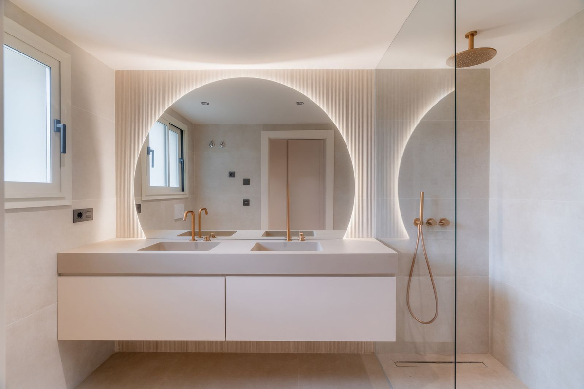 Recently renovated to the highest standards, the apartment boasts refined interior design, premium finishes, and exceptional natural light. Its open-plan layout seamlessly integrates an elegant designer kitchen, fully equipped with high-end appliances, with a spacious living and dining area that seamlessly blends with a large natural wood-clad terrace. It features adjustable underfloor heating throughout. Thanks to its corner location, the terrace enjoys greater privacy, ample outdoor space, and panoramic views of the sea and the lush communal gardens.