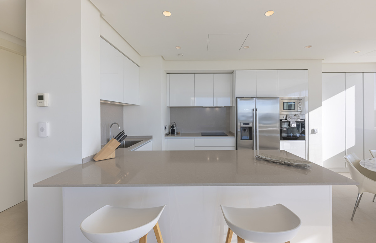 INTERIOR The interior of this residence blends contemporary elegance with absolute functionality. The spacious living-dining area, featuring a comfortable sofa, opens up to a fully equipped open-concept kitchen with high-end appliances and a breakfast bar ideal for socializing. This space is designed for comfort and connection in a warm, welcoming atmosphere.