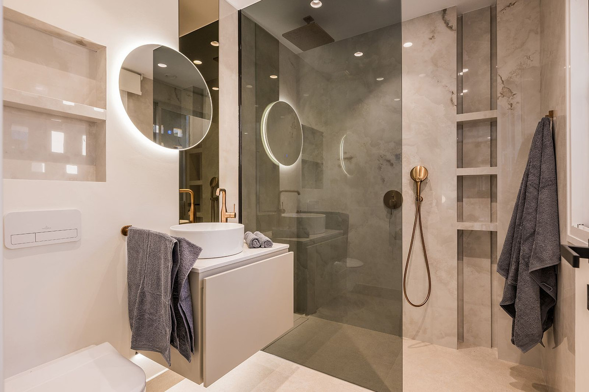 Spanning a generous 218 m² (187 m² interior + 49 m² terrace), the apartment features a spacious open-concept layout, perfect for modern living and entertaining. Three of the four bedrooms include en-suite bathrooms, offering privacy and comfort for family and guests alike. The property is sold fully furnished with high-end contemporary décor and includes a fully equipped open-plan kitchen, a separate kitchenette, and a dedicated laundry room.