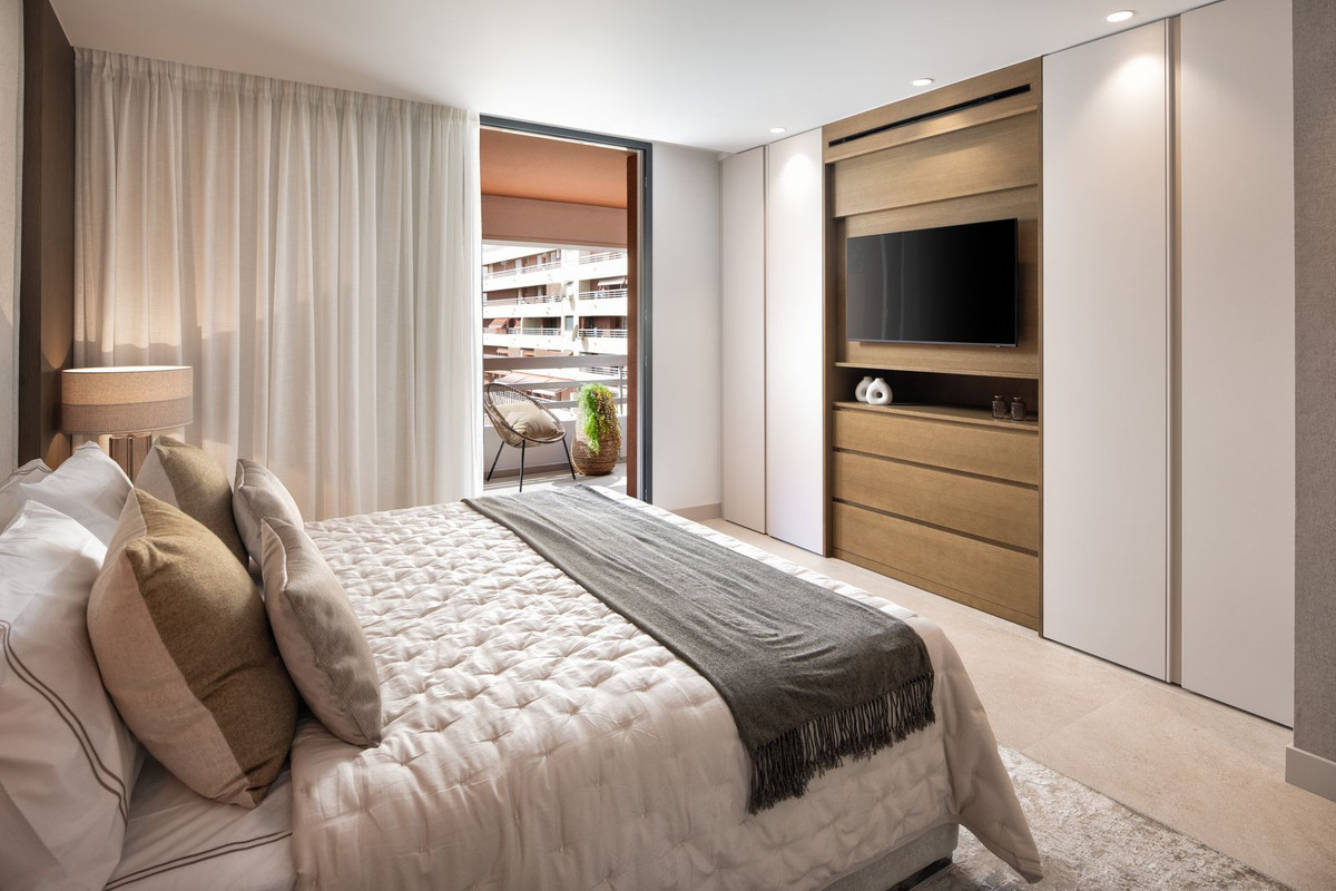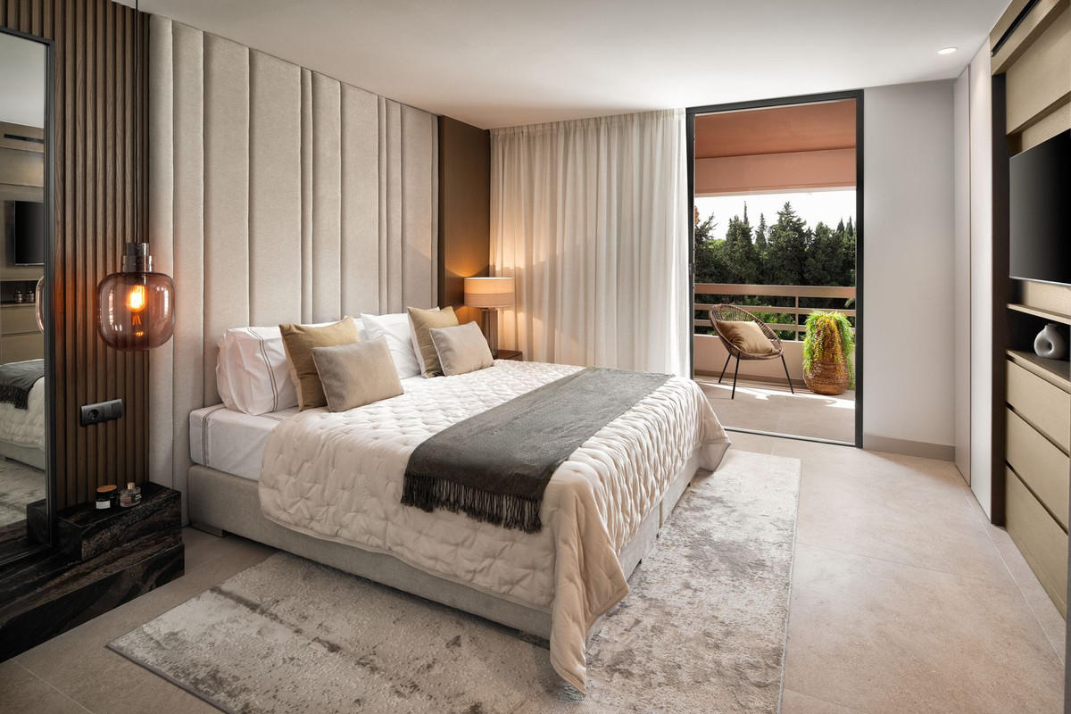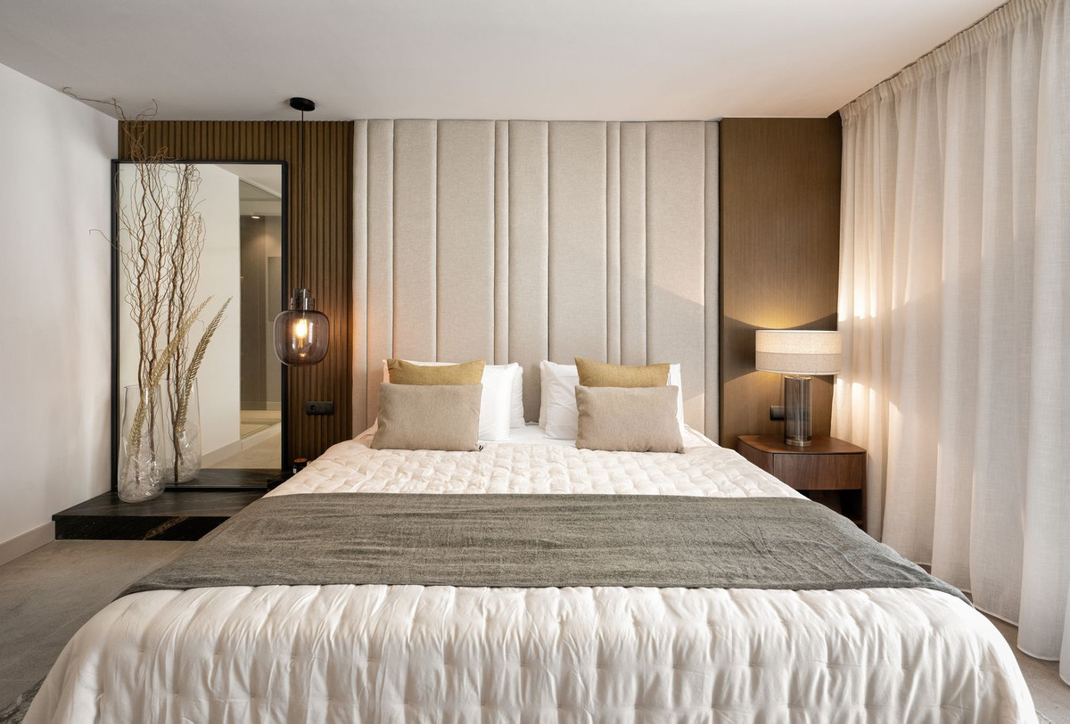Upon entering the apartment, you are welcomed by a stunning island kitchen that sets the scene for the rest of the space as it blends harmoniously into the living area and further into the terrace, giving the impression that it is a part of the living room. Enjoy the peaceful views of the green gardens from your kitchen, where sunlight pours in to fill every square inch. The choice of materials and color palette infuses this area with a sense of peace, comfort, and subtle elegance.