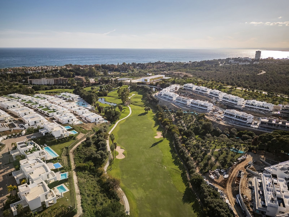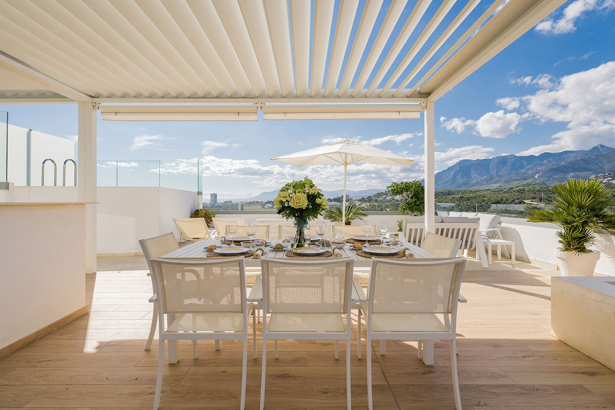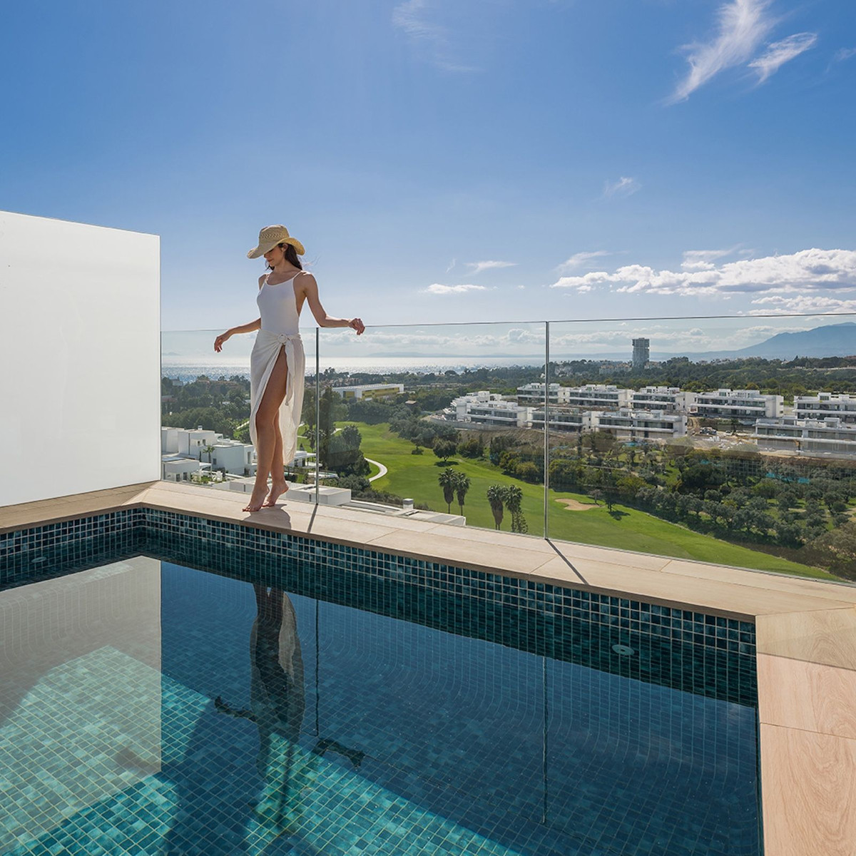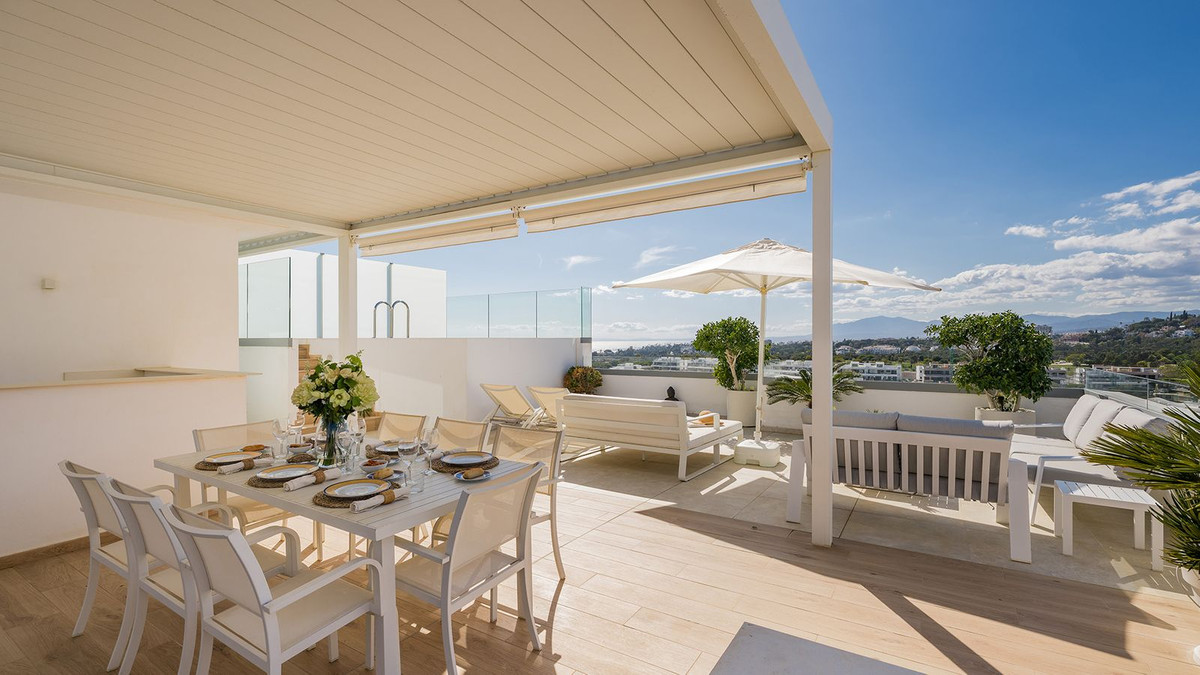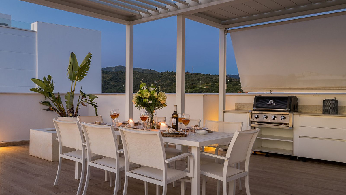 Set over two levels, the 213 m² interior offers a bright and welcoming living space with a modern electric fireplace, a generous dining area, and a sleek, fully fitted kitchen with NEFF appliances. The southwest-facing bedrooms are filled with natural light, and the stylish bathrooms have been thoughtfully designed for both comfort and convenience. One of the best parts of this home is the outdoor space - and there's plenty of it. With 173 m² of sunny terraces, including a huge rooftop solarium, you’ll have everything you need to soak up the Mediterranean lifestyle. Lounge by your private pool, unwind in the chill-out zones, or host family and friends in the outdoor kitchen with a built-in BBQ and dining area - all with fantastic sea and golf views.