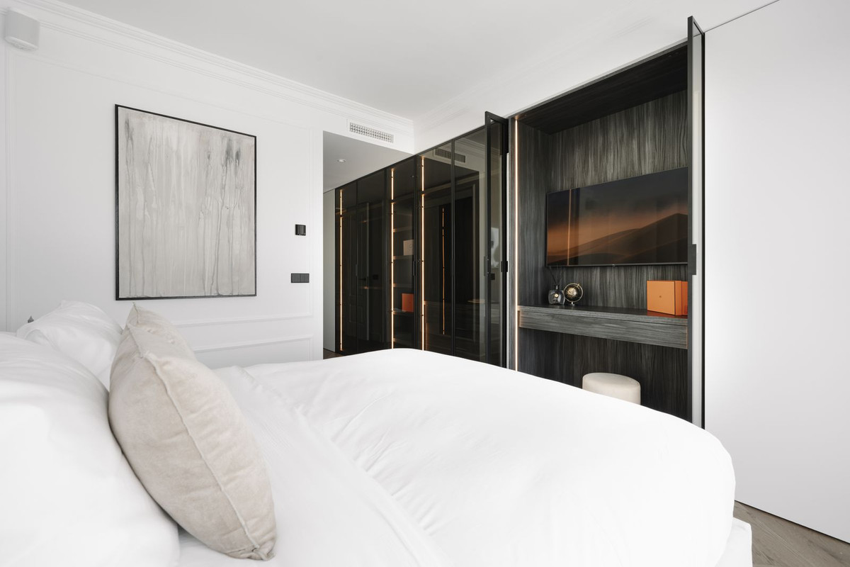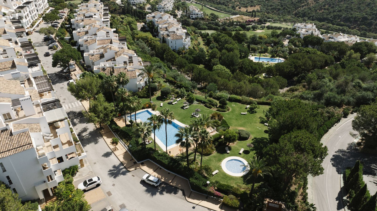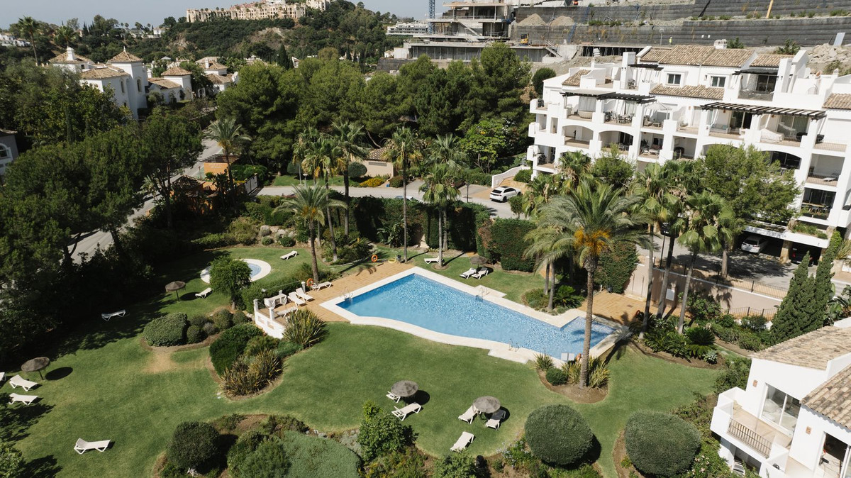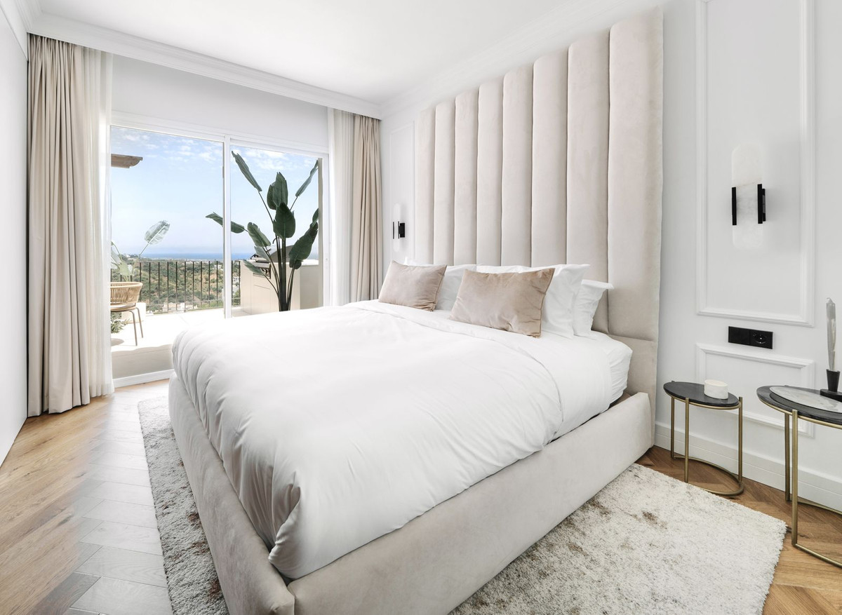 This stunning top floor apartment., set within the prestigious La Quinta Golf resort, offers an elegant & sophisticated interior with breathtaking panoramic views. Having been renovated recently with high quality materials throughout including gorgeous wall panneling and herringbone hardwood floors, an improved lay-out and a bespoke interrior design this is a property that will wow even the most discerning buyer.. The apartment features an open plan kitchen with Smeg appliances and a living room with large sliding doors to the terrace boasting panoramic views to the surrounding landscape, La Quinta Golf and the Mediterranean beyond. The terrace is partially covered with a lounge and dining area as well as an outdoor kitchen making for a perfect space to relax and dine al fresco. There are two guest bedrooms, each with their own en-suite bathroom, as well as a guest WC hidden behind a panelled wall. The masterbedroom is sumptuous and elegant with an en-suite bathroom, beautifully detailed wardrobes and closets as well as access to the terrace. Finally, there is also a very handy and spacious storage room on the ground floor of the building belonging to this apartment, perfect for storing larger items like bicycles or golf equipment.