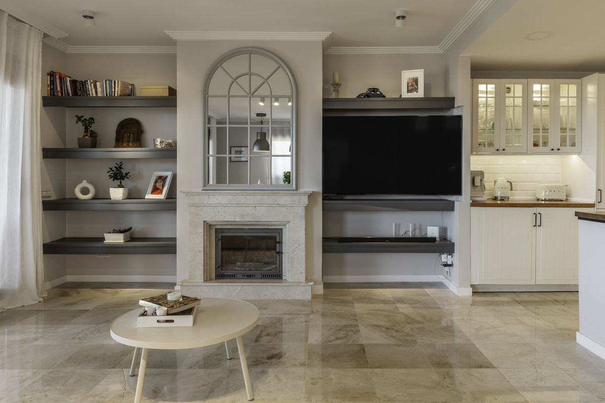 The ground floor welcomes you with a generous living area anchored by a fireplace, flowing into an open kitchen with island and a bright dining space. Panoramic windows dissolve the interior into a large terrace that frames sea and mountain vistas — perfect for golden breakfasts or evenings at sunset. A guest WC completes this level.