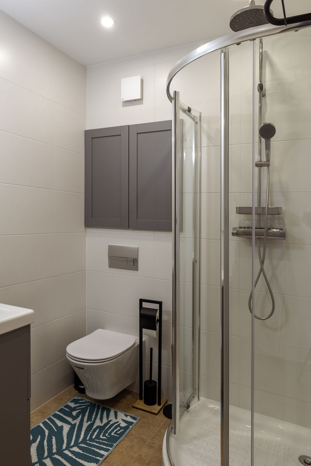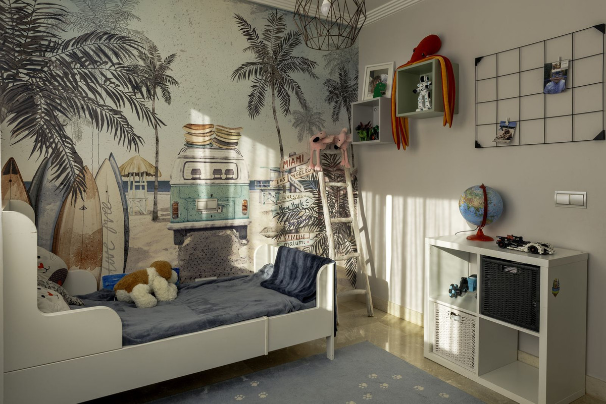 Upstairs, the master suite is a private refuge with an en‑suite bathroom and a large walk‑in closet. Two further bedrooms share a generous bathroom; all bathrooms combine showers and bathtubs for everyday comfort. Built‑in wardrobes and expansive terraces with panoramic views add practical elegance.
