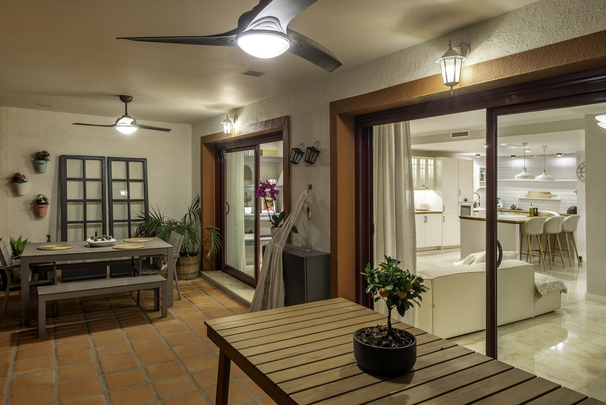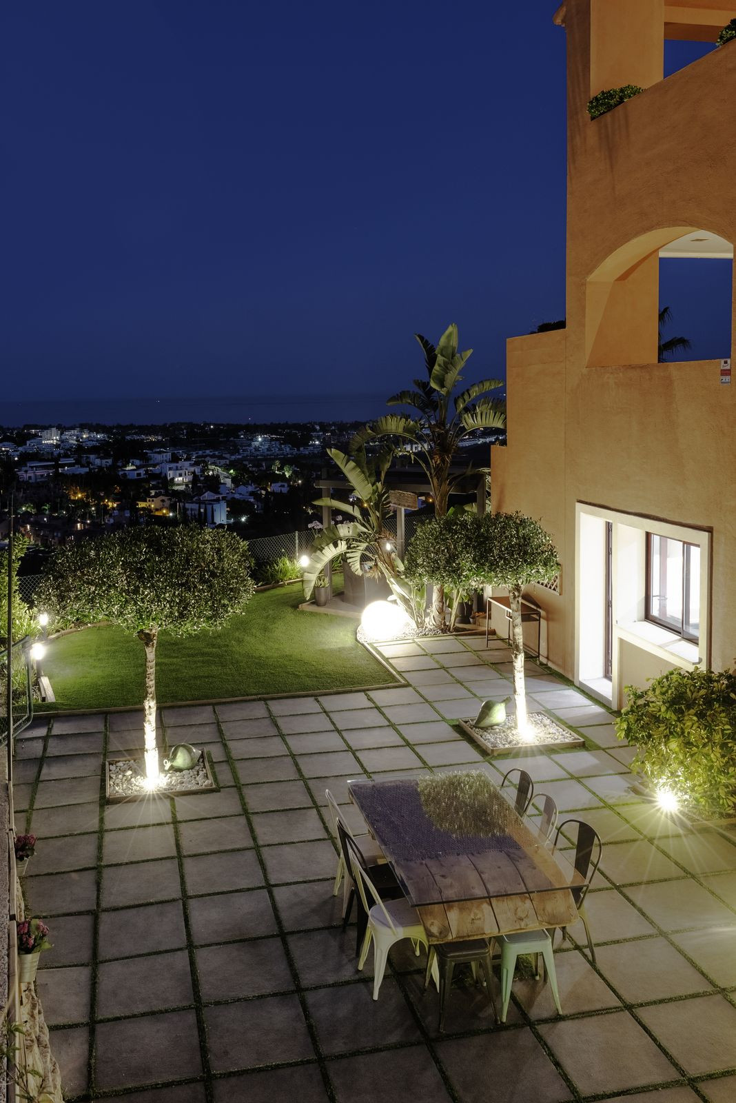 Key features - Living area: 225 m² - Orientation: southeast - Location: El Paraíso Alto (Benahavis) — gated and guarded community - Communal pools: 3 - Bedrooms: 4 (including an independent garden studio ~45 m²) - Bathrooms: 3 + guest WC - Garden with BBQ area, chill‑out corner, outdoor shower and six‑person jacuzzi - Panoramic terraces with sea and La Concha mountain views - Private garage (space for 2 cars) + storage room - Fully renovated 2024 with high‑end finishes (marble, travertine, solid wood) - Equipment: solar panels for hot water, reversible air conditioning, fireplace, irrigation and garden lighting - Tourist license active - Benahavis location — reasonable local taxes and community access