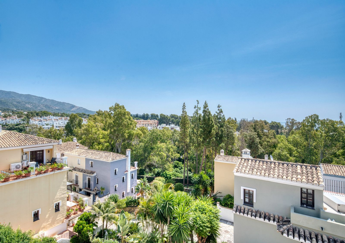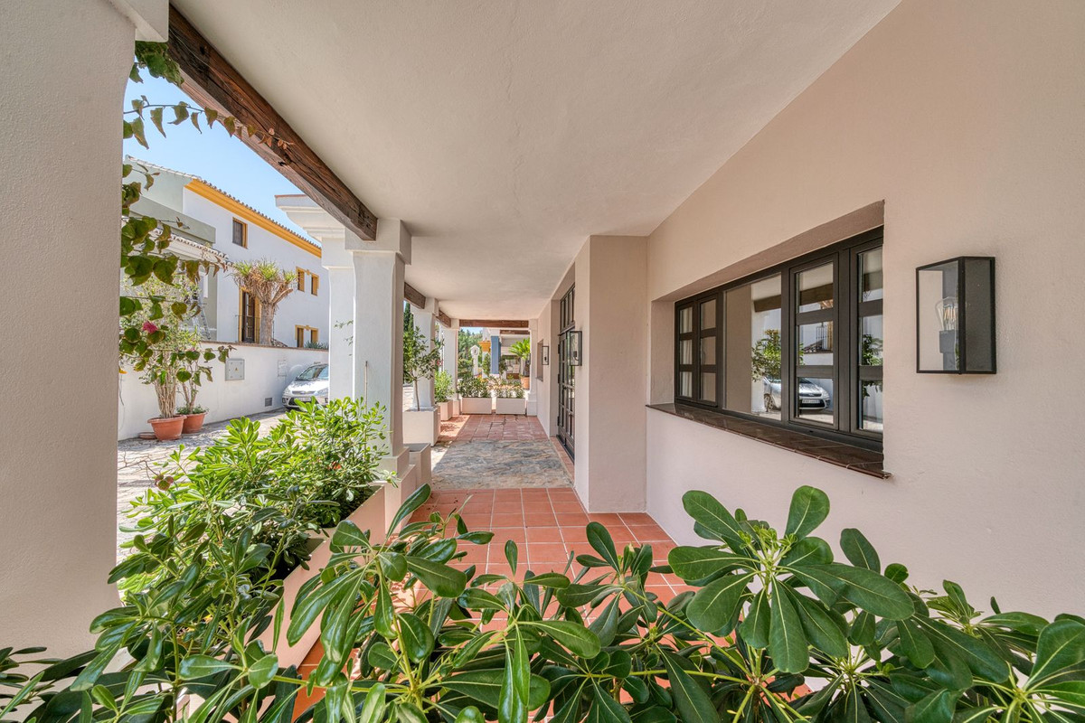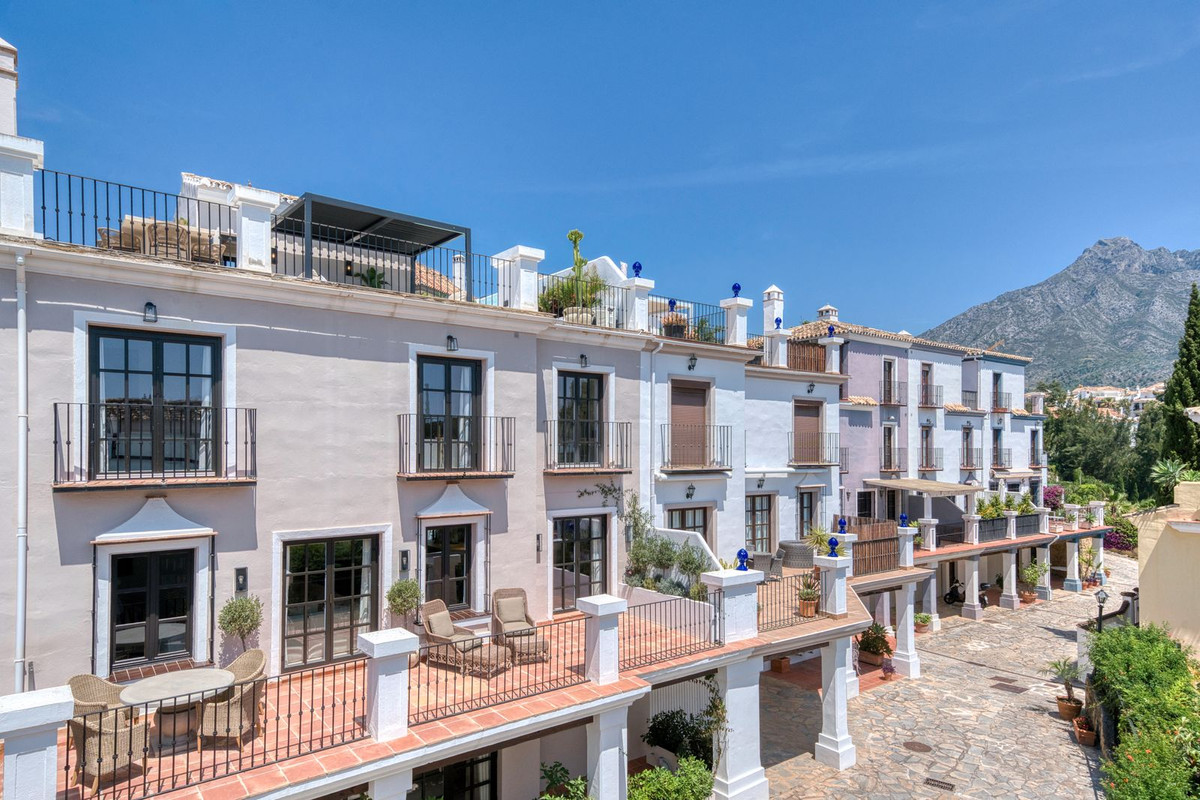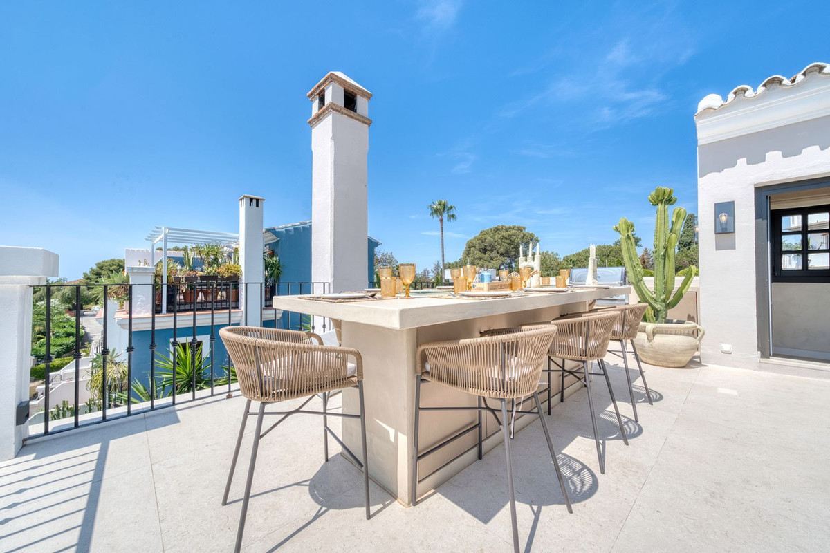 Set within an exclusive gated community on Marbella's Golden Mile, this exquisite townhouse captures the essence of classic Andalusian architecture with a luxurious contemporary edge. Located in the heart of Marbella’s prestigious Golden Mile, it offers total privacy, timeless design, and immediate access to the coast’s most iconic beach clubs and fine dining. The private community gated and secure, low-density community of just 24 homes, surrounded by Mediterranean gardens, cascading fountains, and a sculpted swimming pool. With 24-hour security and on-site maintenance, it offers the peace of a private retreat just moments from the beach and the Paseo Marítimo. You enter this stunning home via a sun-drenched courtyard, ideal for alfresco dining, and step into a home where every detail has been carefully curated. The main floor flows beautifully, featuring a designer kitchen with Gaggenau fitted appliances, a central island, and a generous dining area. The open-plan living room is framed by limed oak ceiling beams and oversized sliding doors that lead onto a spacious terrace, flooding the space with light and connecting indoor and outdoor living. Downstairs, the lower level is all about comfort and entertainment, offering a private cinema lounge with an oversized sofa, a secondary kitchen and bar, wine display, and two beautifully appointed guest suites, each with its own bathroom and access to a covered terrace. Upstairs, the master suite is a tranquil escape with a dressing room, full en-suite bathroom, and a beautiful free standing bathtub. A fourth bedroom completes the level, ideal for family or additional guests. The rooftop terrace is simply show-stopping, with panoramic views stretching from La Concha to the rooftops of Puente Romano, the Mediterranean Sea, and even Gibraltar and North Africa on a clear day. Designed for year-round living, it features a heated plunge pool, BBQ and dining area, and a shaded chill-out lounge, capturing the very best of Marbella’s indoor-outdoor lifestyle.
