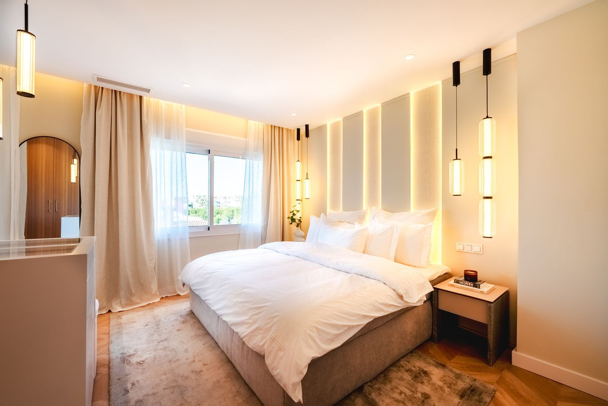 This brand new renovation project is a beautifully crafted 5-bedroom, 5-bathroom Town Villa located on Marbella’s prestigious Golden Mile. Blending contemporary Scandinavian elegance with Mediterranean charm, the home offers four levels of luxurious living with expansive south-facing terraces and sweeping sea views.